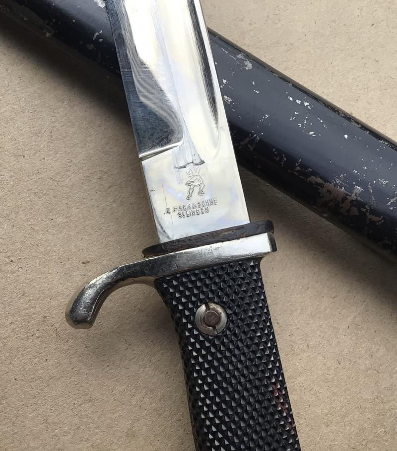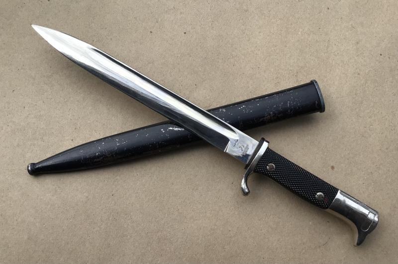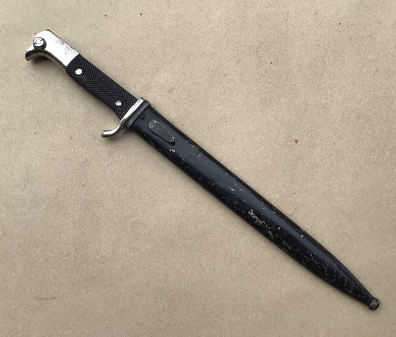 A very nice clean example of the other ranks pattern for all arms of service. Bright nickel finish to the blade. The blade maker marked. E. Pack and sons Solingen. Working locking stud and artillery red felt padding to the mortiseslot. Comes with its matching all steel black painted scabbard also in excellent and matching condition.