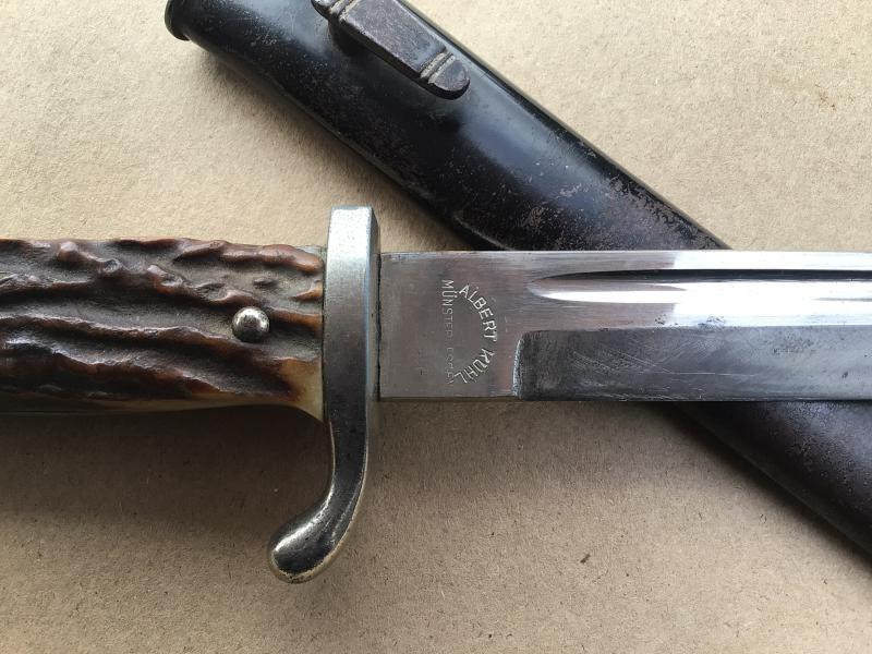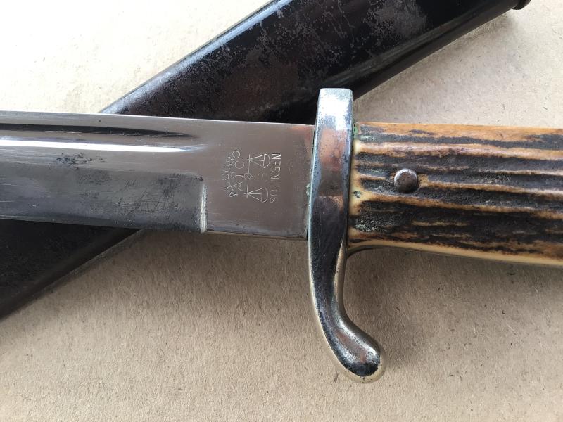 Stag horn grip Private punches example of the officers pattern KS98 parade bayonet for all arms of servcie. The blade maker marked” Alcoso” of Solingen. The blade edge has been sharpened. Working locking stud. Extensive wear to the nickel finish on the pommel and cross guard. The all steel scabbard with heavy wear to the original black painted finish.