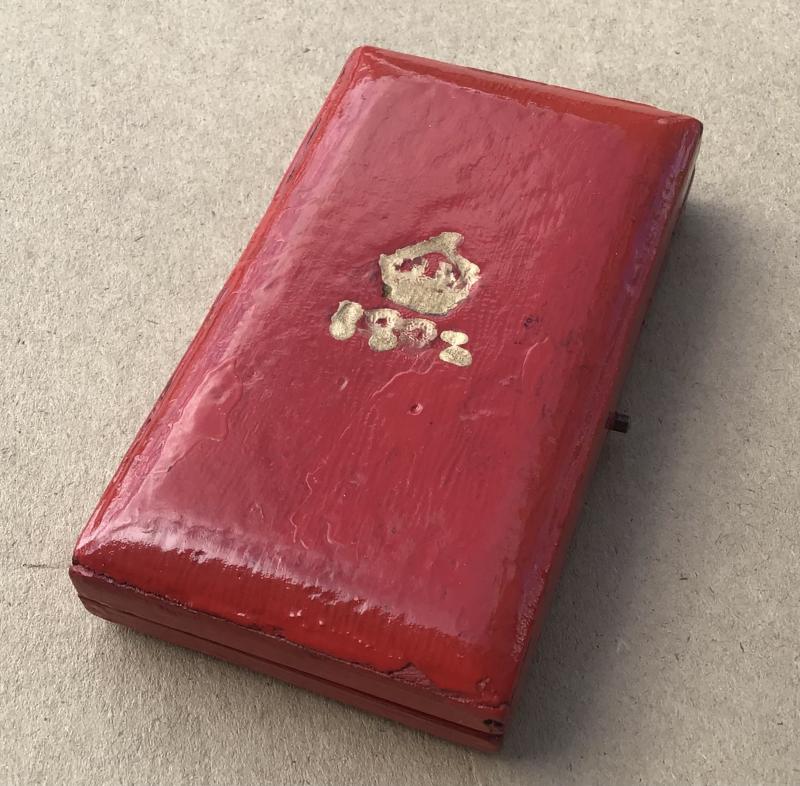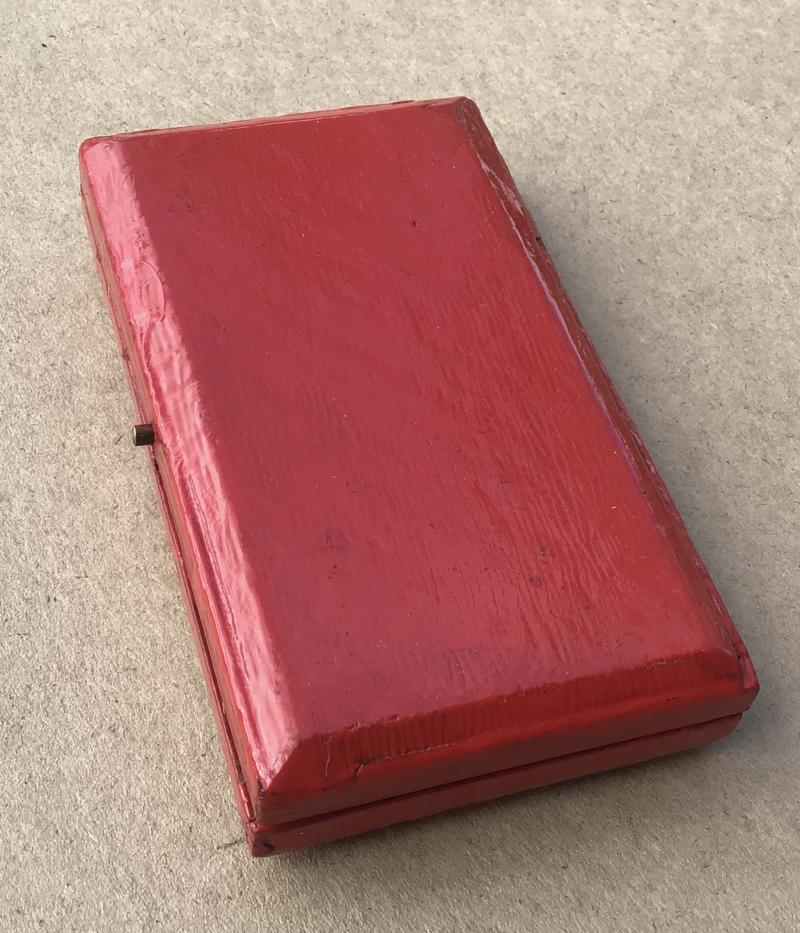 The case has been. Repainted in a thick red paint on both sides. Why? Is anyone’s guess. Nevertheless the medal still displays well with the lid open.