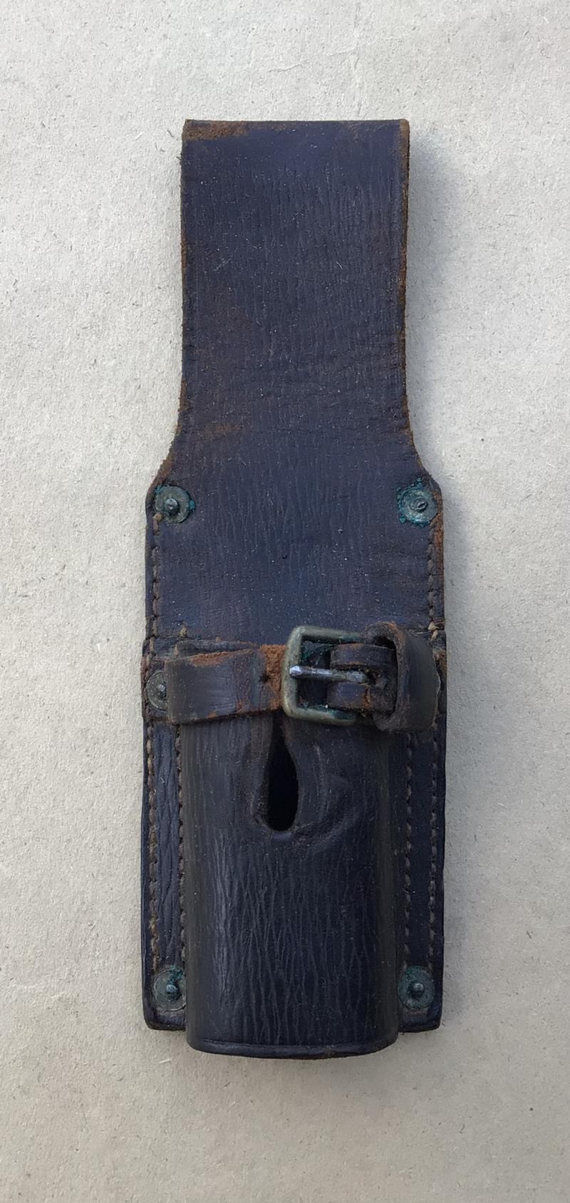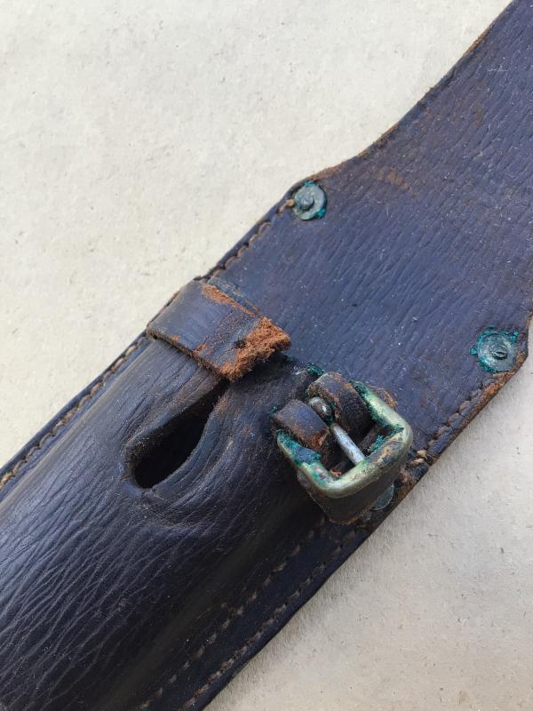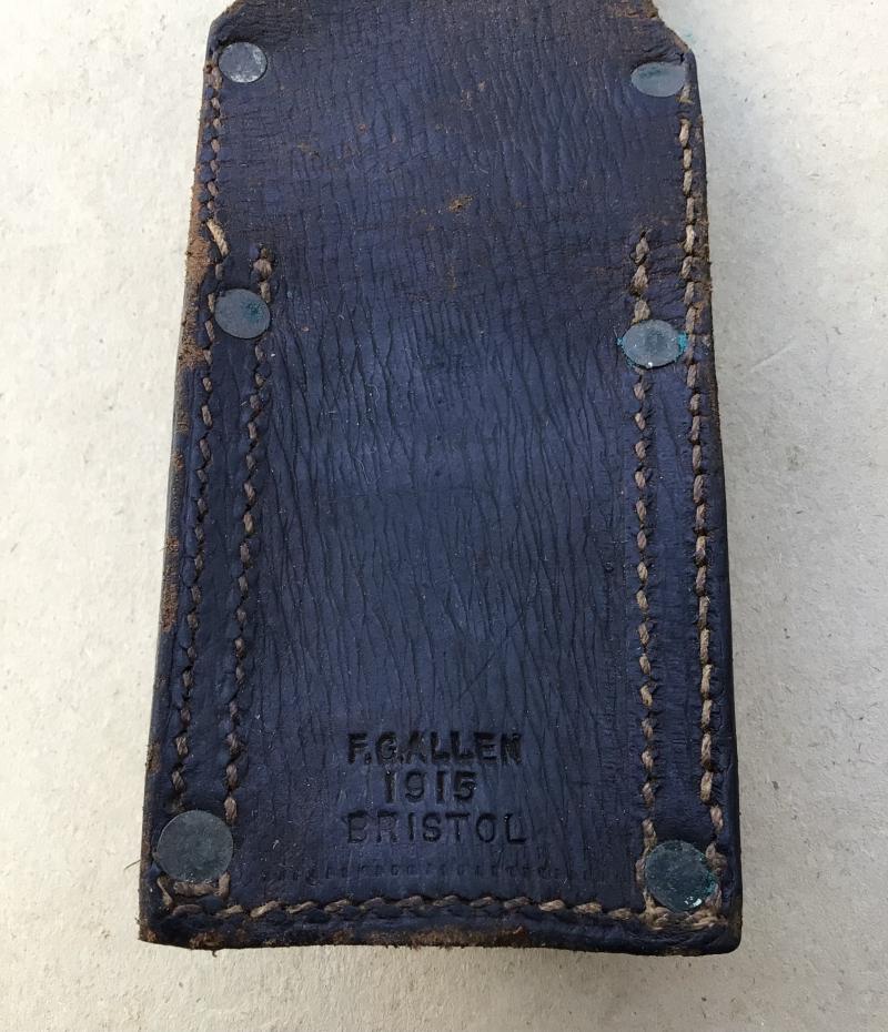 Large broad arrow stampings. Maker marked by Allen of Bristol and dated 1915. The scabbard securing strap is broken short of the buckle.