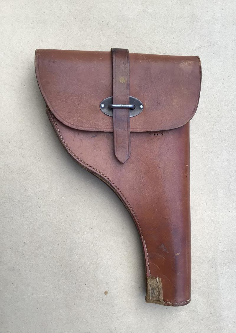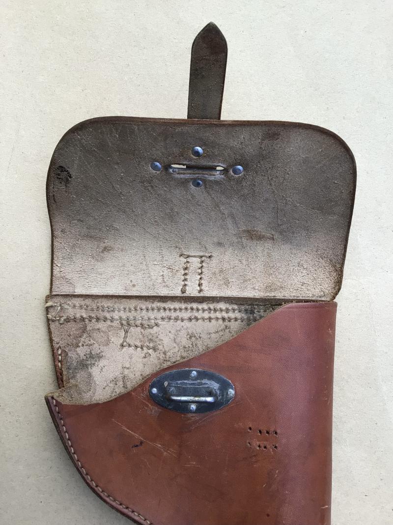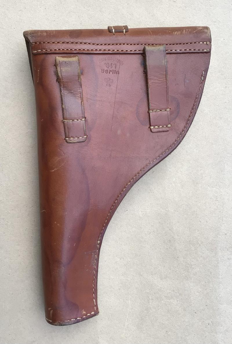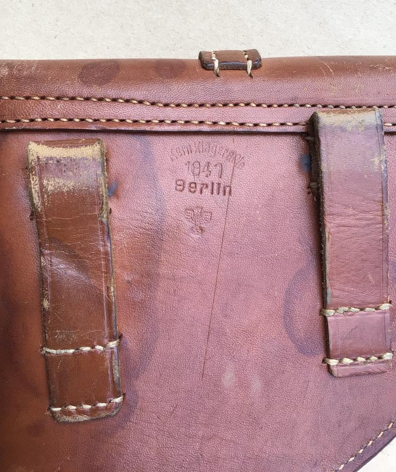 Russet brown leather. Maker marked Berlin and dated 1941. Missing the cleaning rod retention cup and strap.