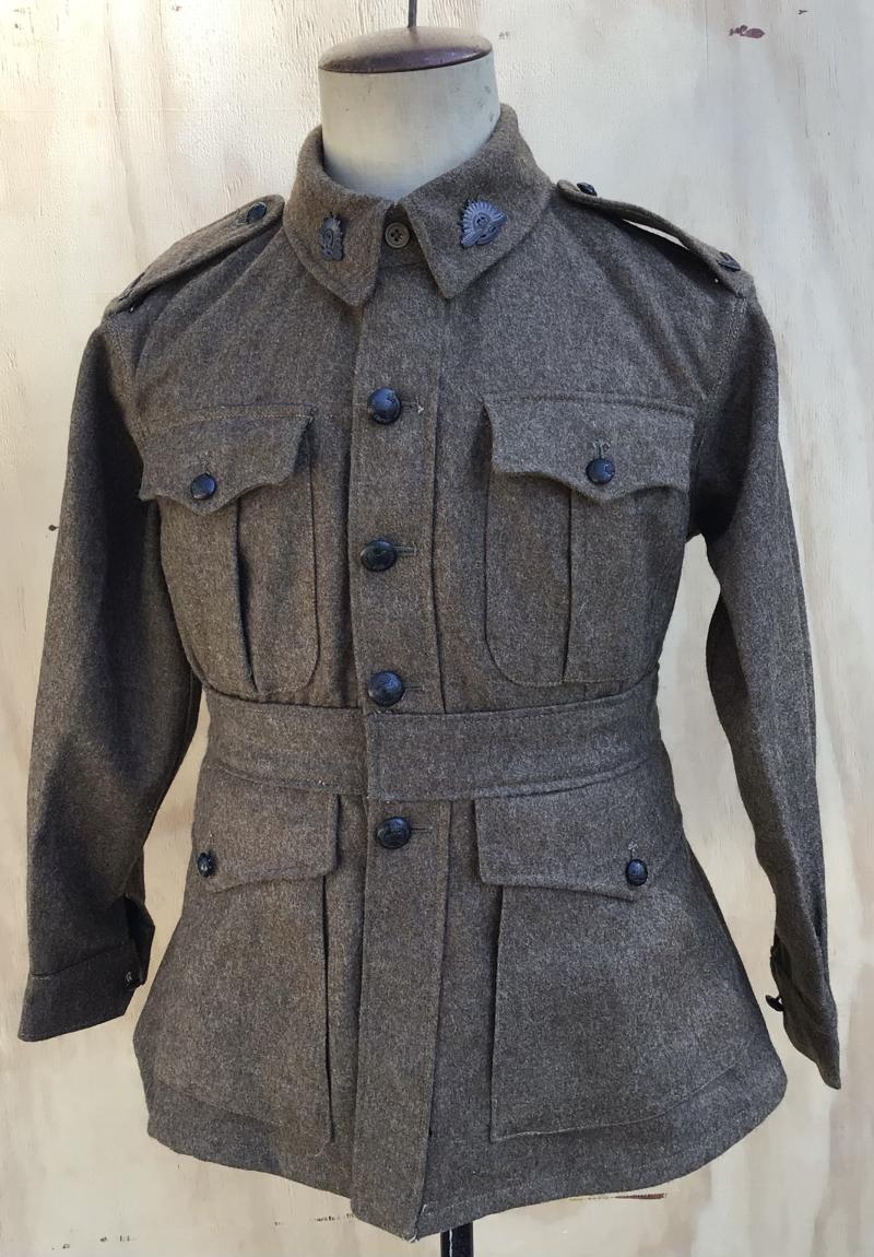 A very well preserved example of the 1917 pattern Australian other ranks servcie dress tuinc. British made and dated dated 1940. British khaki wool serge four pocket tunic. Bakelite AMF buttons and oxidized rising sun collars and Australian nationality shoulder titles. Maker ordnance marked marked “Jaket Service Dress Australian Military Forces” and dated 1940. Unissued condition. These were made in the anticipation of the arriving Australian troops in England prior to their eventual deployment to the Mediterranean theater.