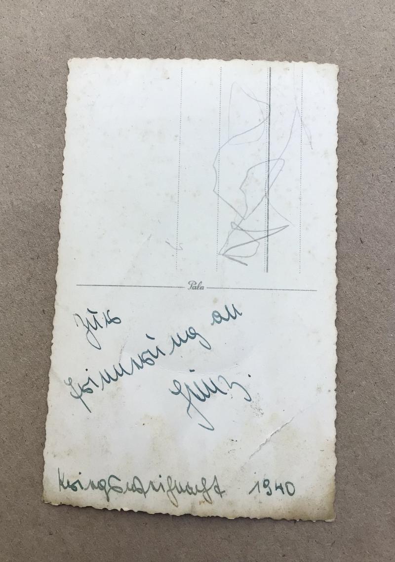 Superb studio shot of an aircrew member wearing full winter flying jacket, leather helmet and goggles. 1940 dated reverse.