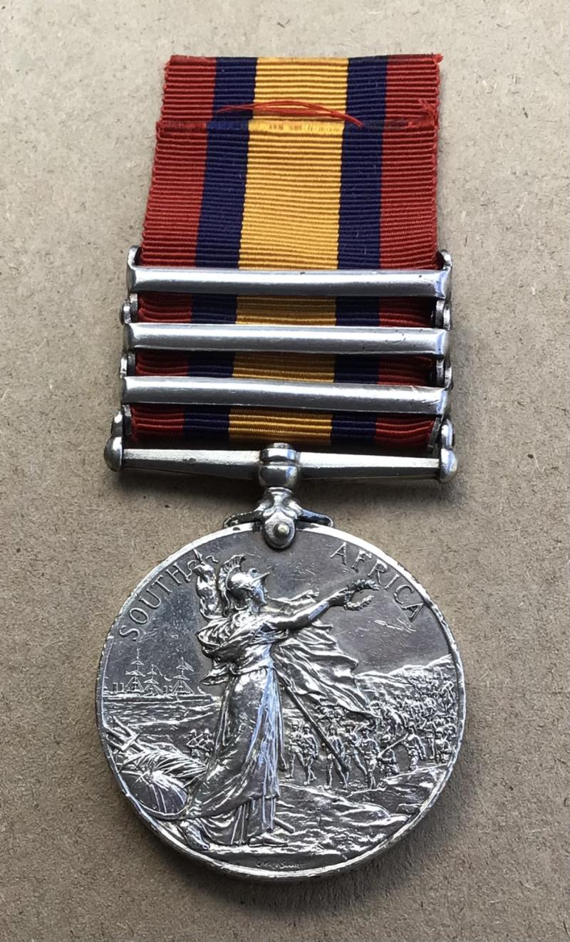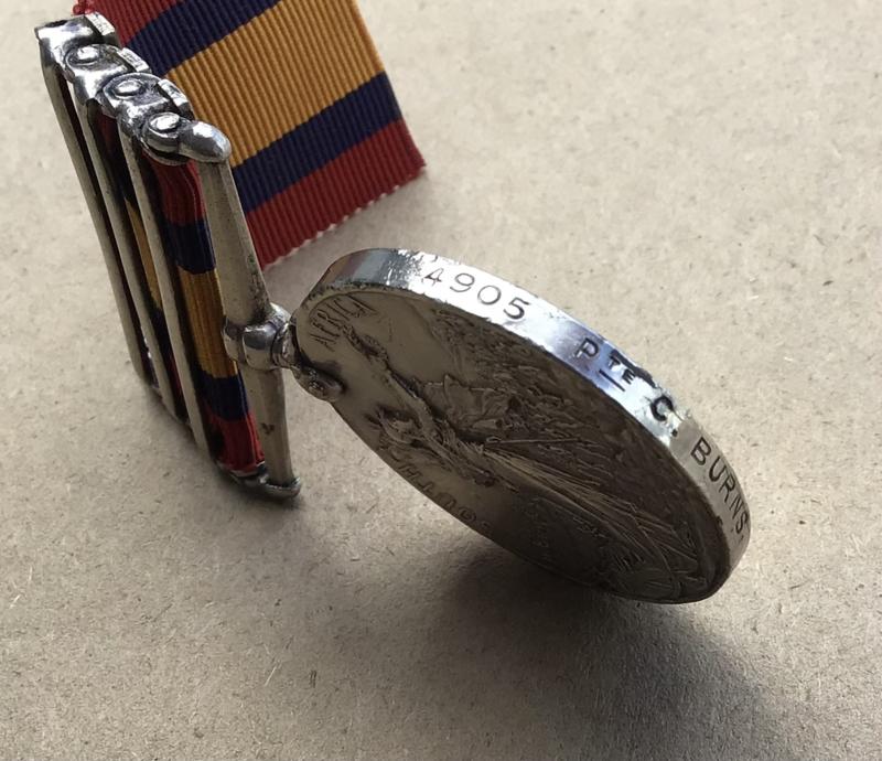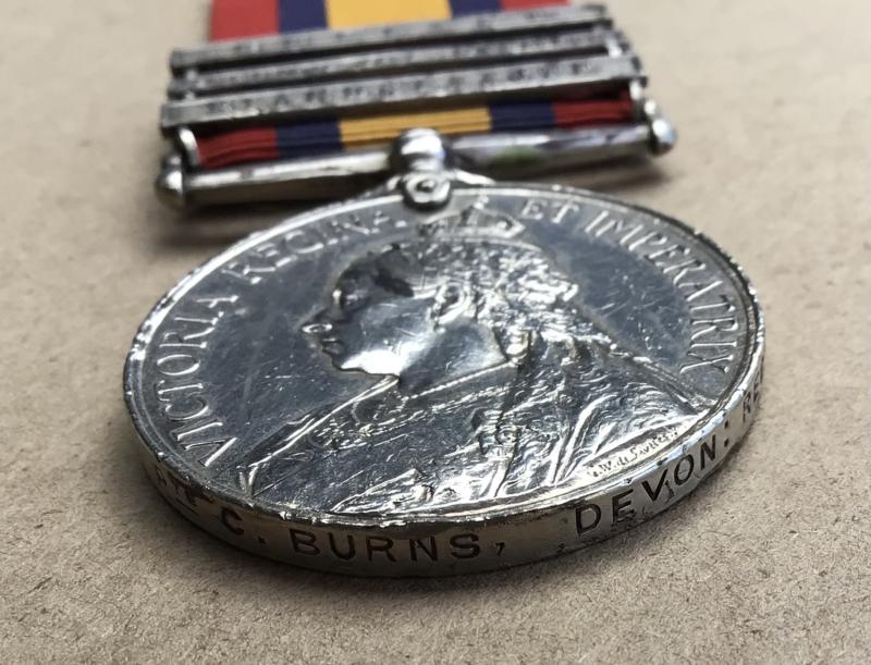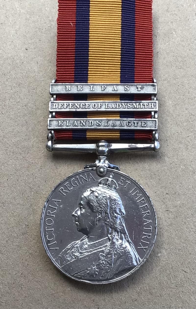 Three clasps “Elandslaagte”, “Defence of Ladysmith”, “ Belfast”. Correctly impressed (4905 PTE C BURNS DEVONREGT). Bars all confirmed. Original full size medal.