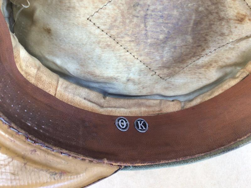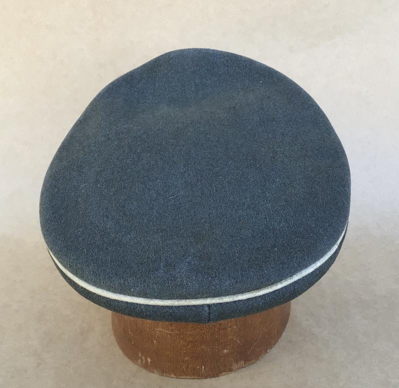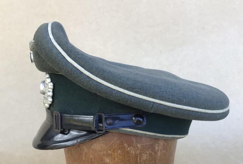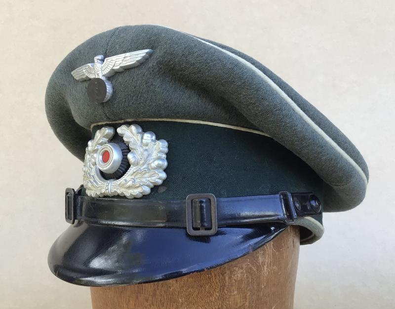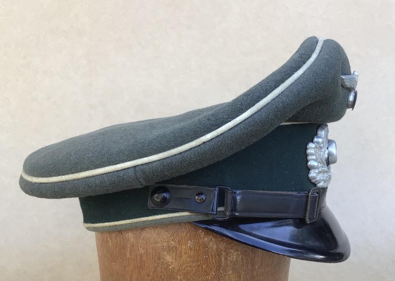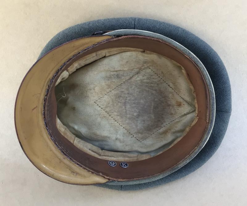A supurb private purchase example with a lovely saddle shape. Black Grey doe skin wool body with green wool cap band. Vulcan fiber visor. Aluminum cap wreath , cockade and cap eagle. Complete with black patent leather NCO’s chin strap. The rayon lining intact and in good condition but with obvious age stain, the brown leather sweatband also intact and with owners aluminum initials.