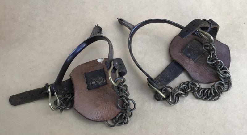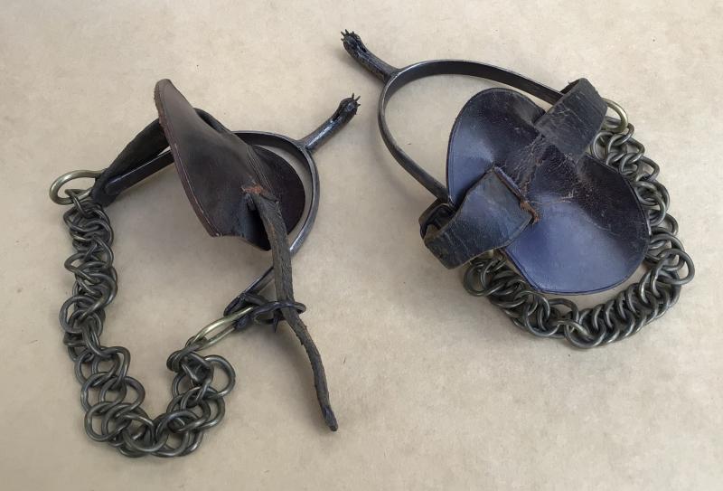 Nickel finish yokes with matching heel chains and leather butterflies. Unmarked.
