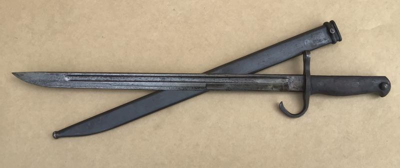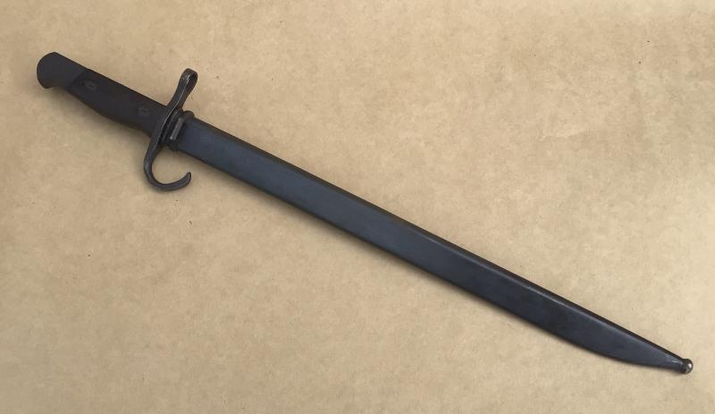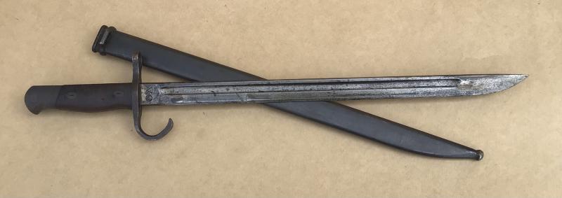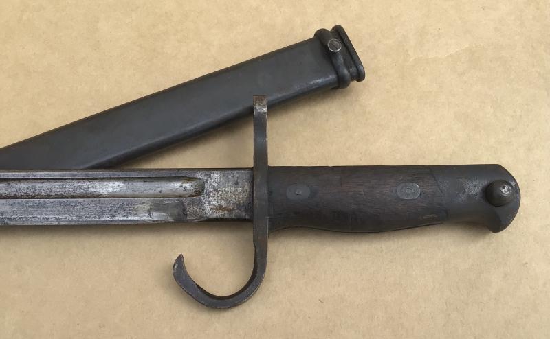 Original wooden grips, working locking stud. Age stain to the blade. The cross guard and pommel with original bluing. Unknown maker arsenal mark Steel scabbard in nice condition.
