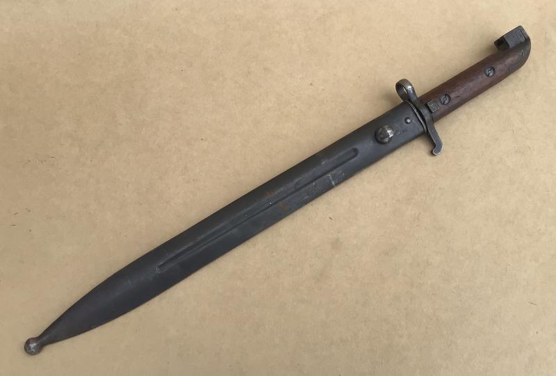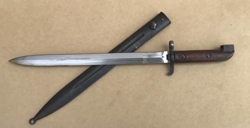 A nice clean example of this hard to find bayonet. Original wooden grips. Working locking stud. Royal proof and acceptance stamps. Very bright blade in lovely condition as is the matching all steel scabbard.