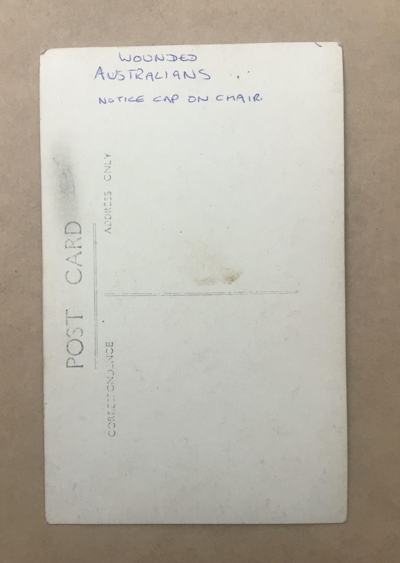 Australian wounded soldiers outside of barracks in convalescing outfits, note the visor cap with rising sun on the back of the chair.