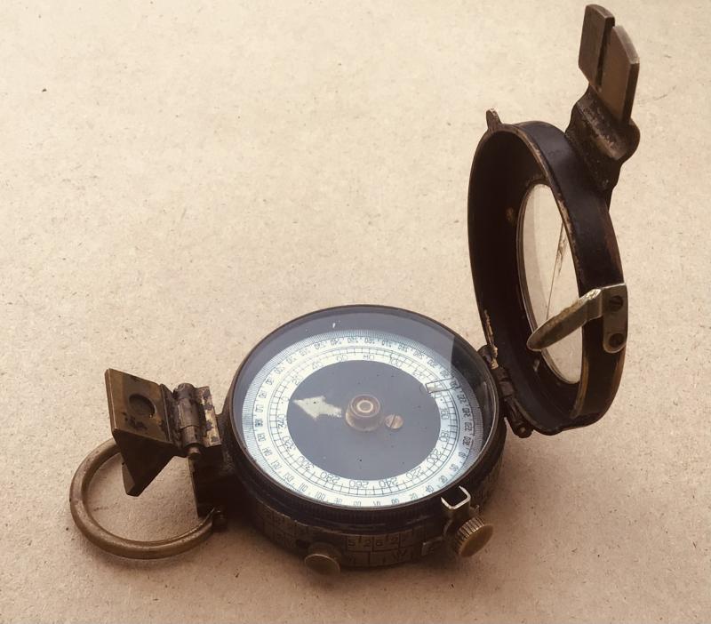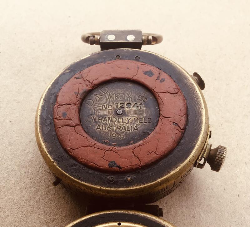 All brass. The base marked “D arrow D” with Melbournes maker and dated 1941. The brass well worn from its blackened finish. The lense cover with a small chip to the center. Working condition.