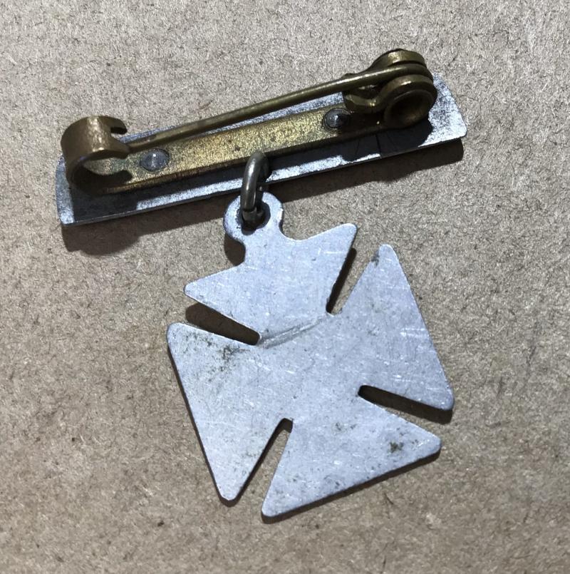 Aluminum top bar engraved “Portion of Zepp” and fitted with a brooch pin reverse with a pendant cross in aluminum and also engraved “ L15 Strafed in Thames 1-4-16”. Approx 30mm x 30mm.