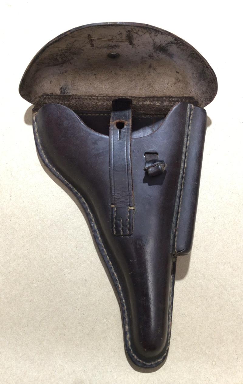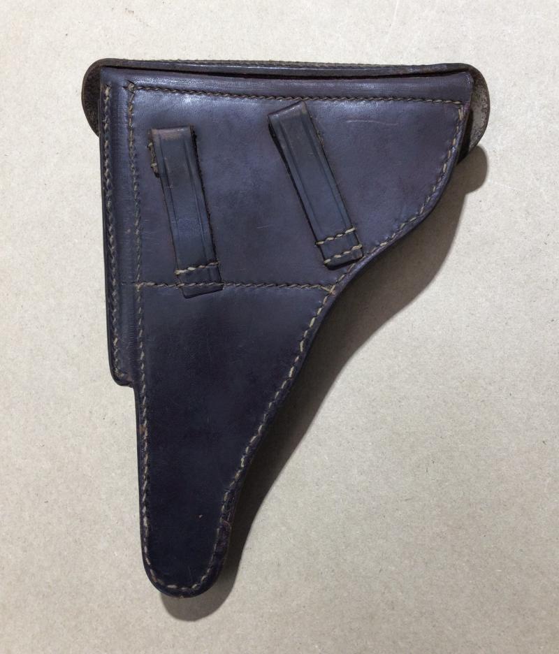 Dark brown leather hard shell Luger holster with the definitive front reversed securing strap as used by police units. Interesting there is no provision for the take down tool on the inside flap. No markings at all, no waffenamt stamsp or dates.