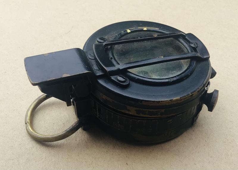 Blackened brass case. London maker and dated 1940. The lid cover a bit tight to open and squeaky. The inside dial not working very well due to having lost some of the internal liquid. Still a good static display item.
