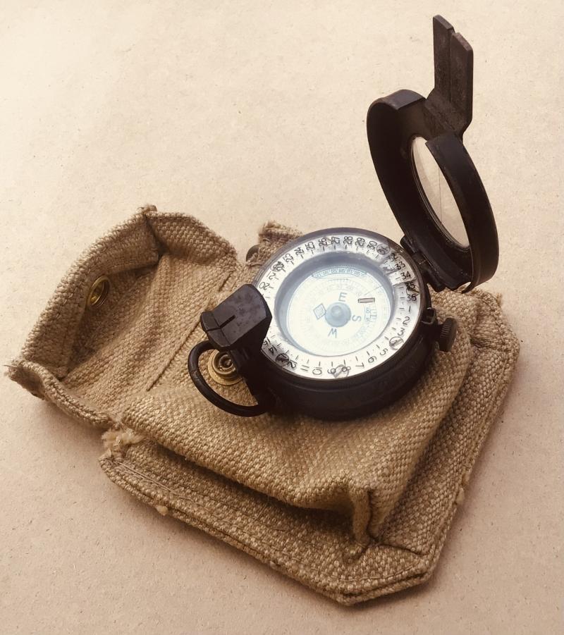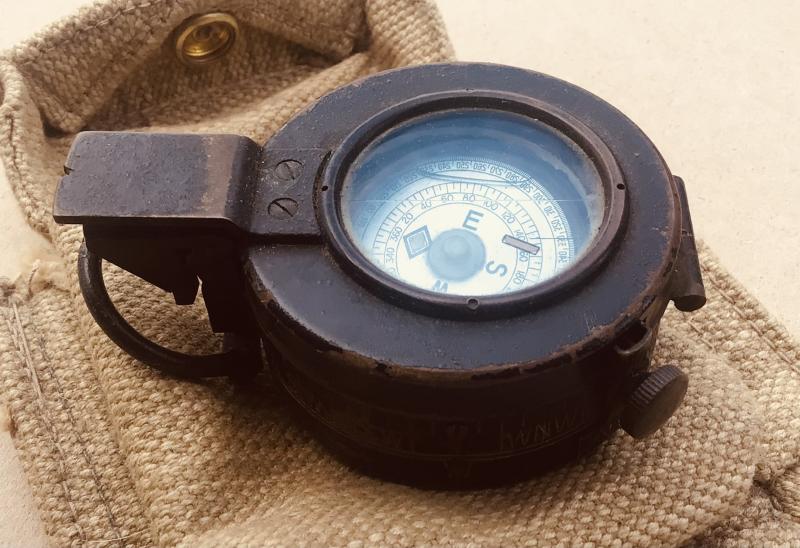 A good well used example of the British pattern field compass. Blackened brass. Not quite working due to having lost some of its internal liquid. Australian made with Melbourne maker and dated 1942. A good static display item. Come with pattern 37 pistol ammunition pouch making do as a compass pouch.