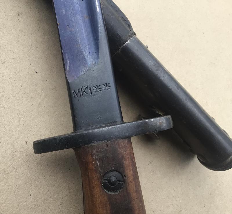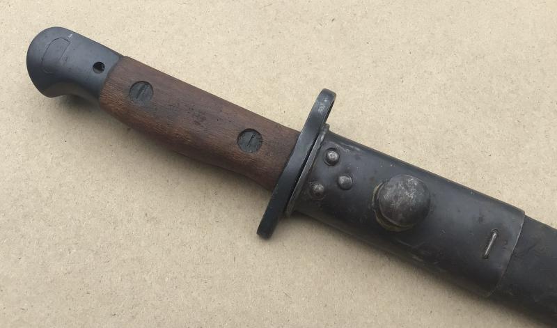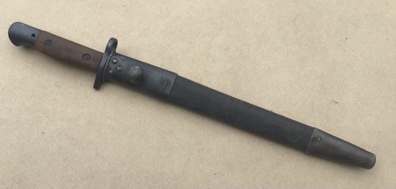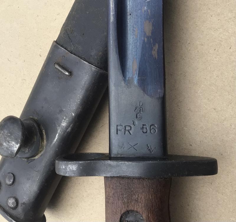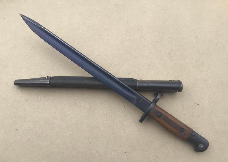 A very nice example. The blade along with the cross guard and pommel heavily blued. The blade marked FR (Factory Repairs) and dated 1956. Comes with its leather scabbard also in VGC.