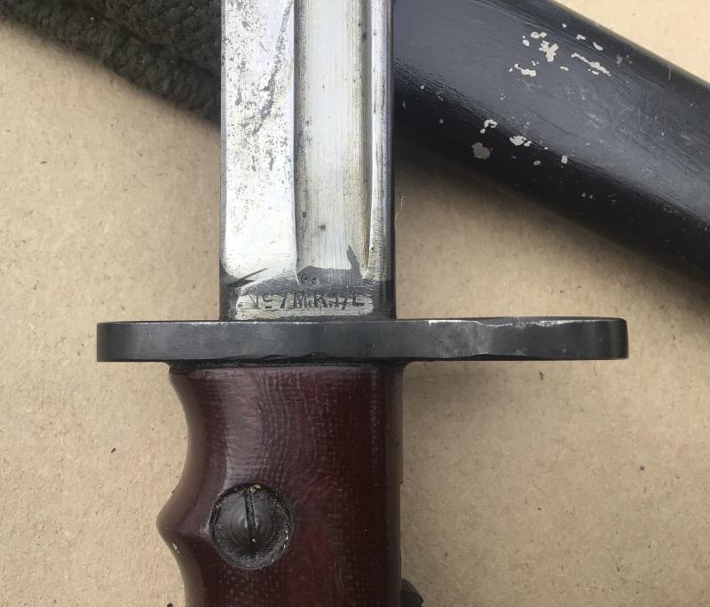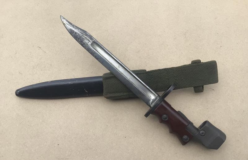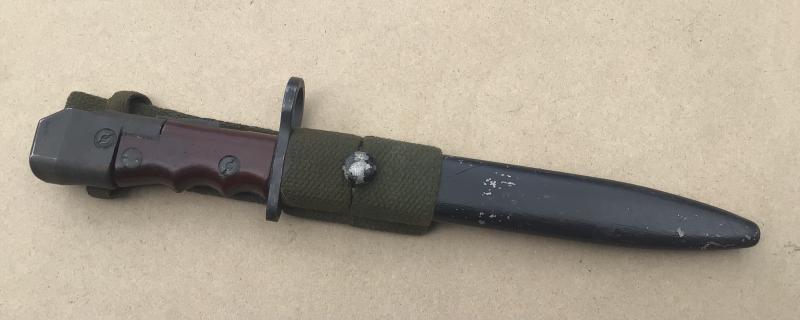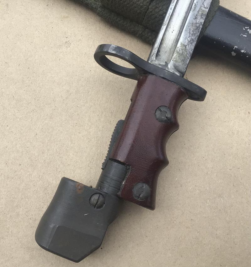 A very nice example with original Bakelite grips and working locking stud. Together with its black painted all steel scabbard fitted with a green web Pattern 37 frog.