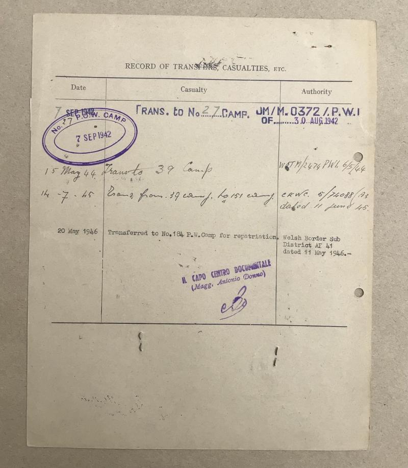An original British POW file card (approximately A4 size). ‘Dated 1942-1946 for a Corporal of the Italian Artillery. Complete with original identity photo attached.