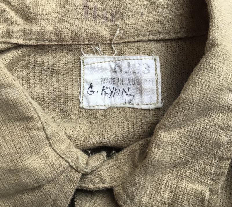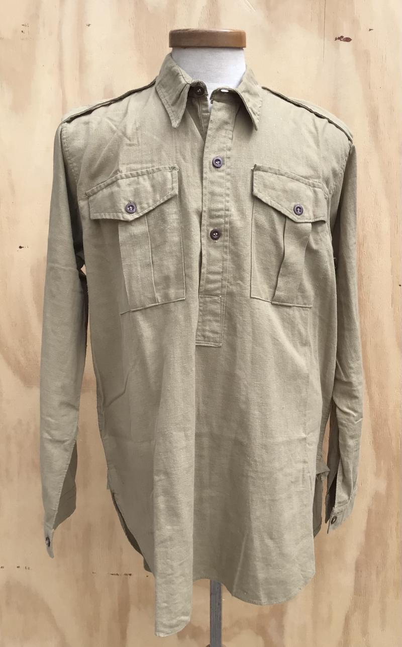 A nice example. Khaki Aertex cotton pull over type shirt. Has a small repair to the top left shoulder and a few small stain marks in the same area. 1943 dated.