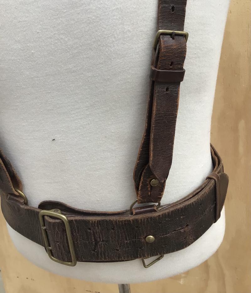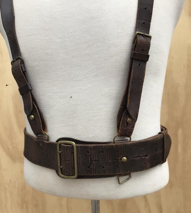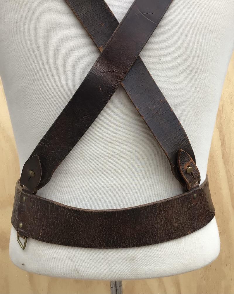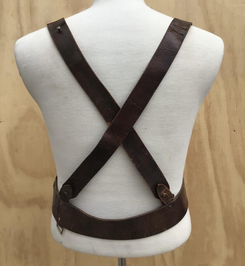 Brown leather with double matching cross straps. The leather nice and supple. The buckle tab clearly marked with “D” arrow “D “CMF” “SA” (South Australian Militia) and dated 1912. Belt extends to approx 1100mm.