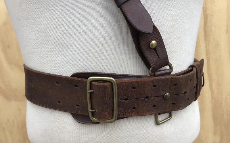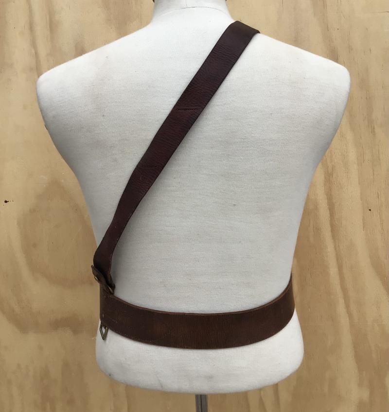 Dark brown leather with single cross strap. Not dated. Cross strap and belt have some different hand written initial on the undersides. Belt extends to approx 1050mm. The tab is stamped “Large”.