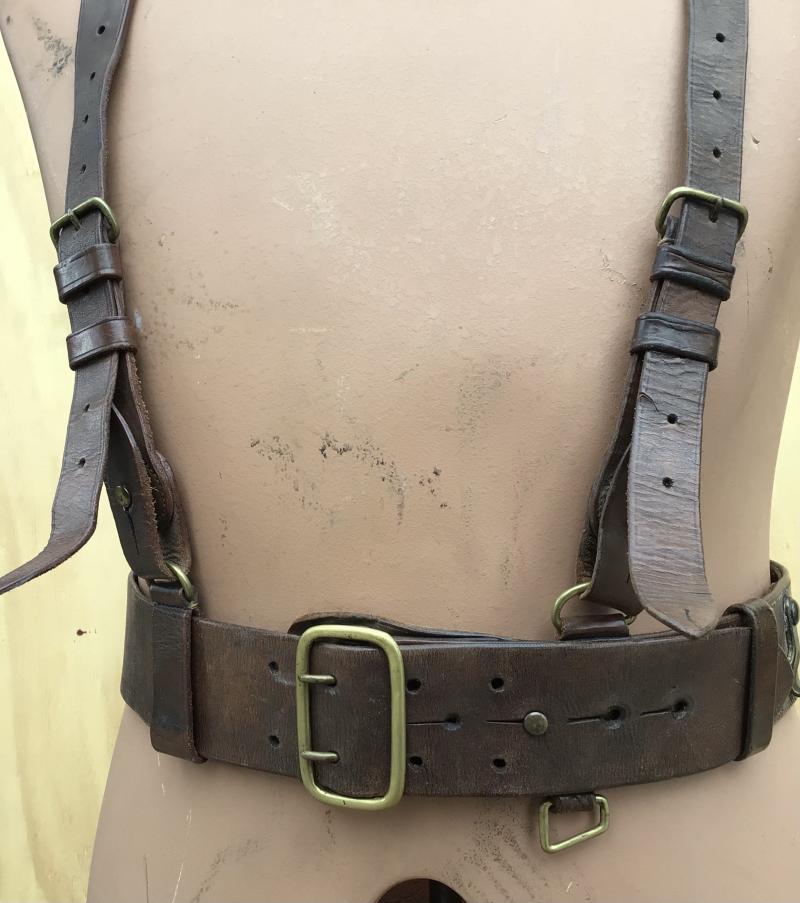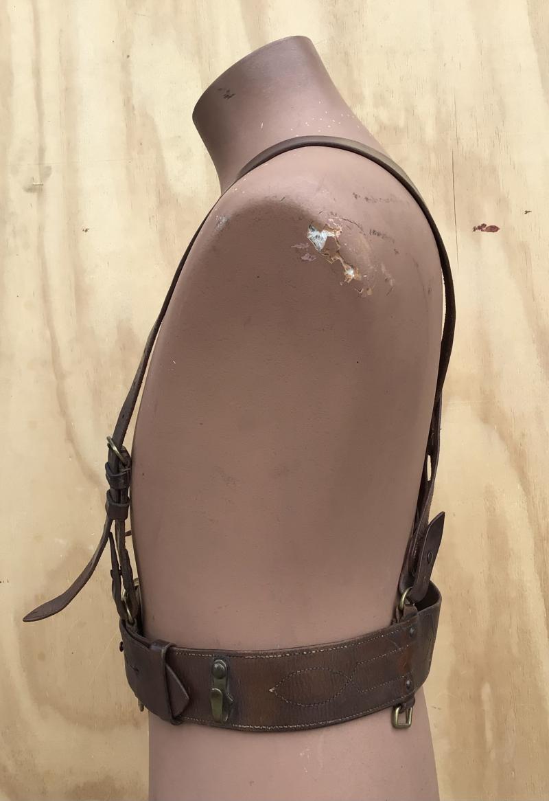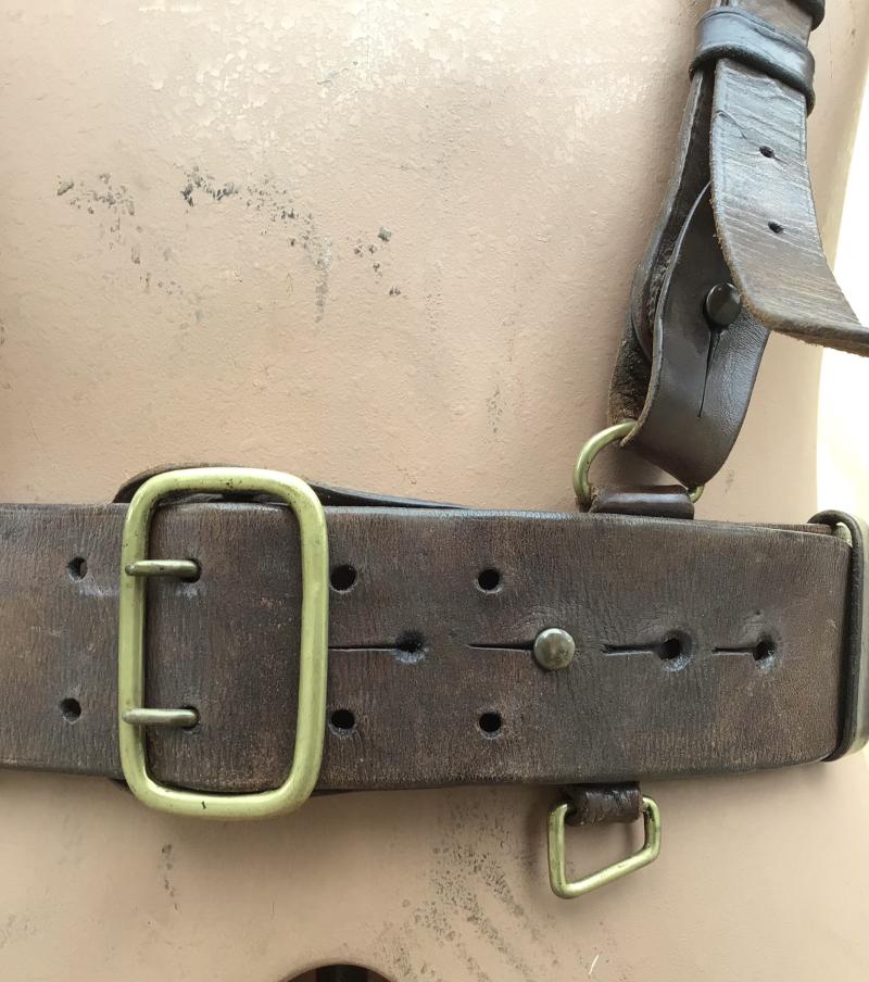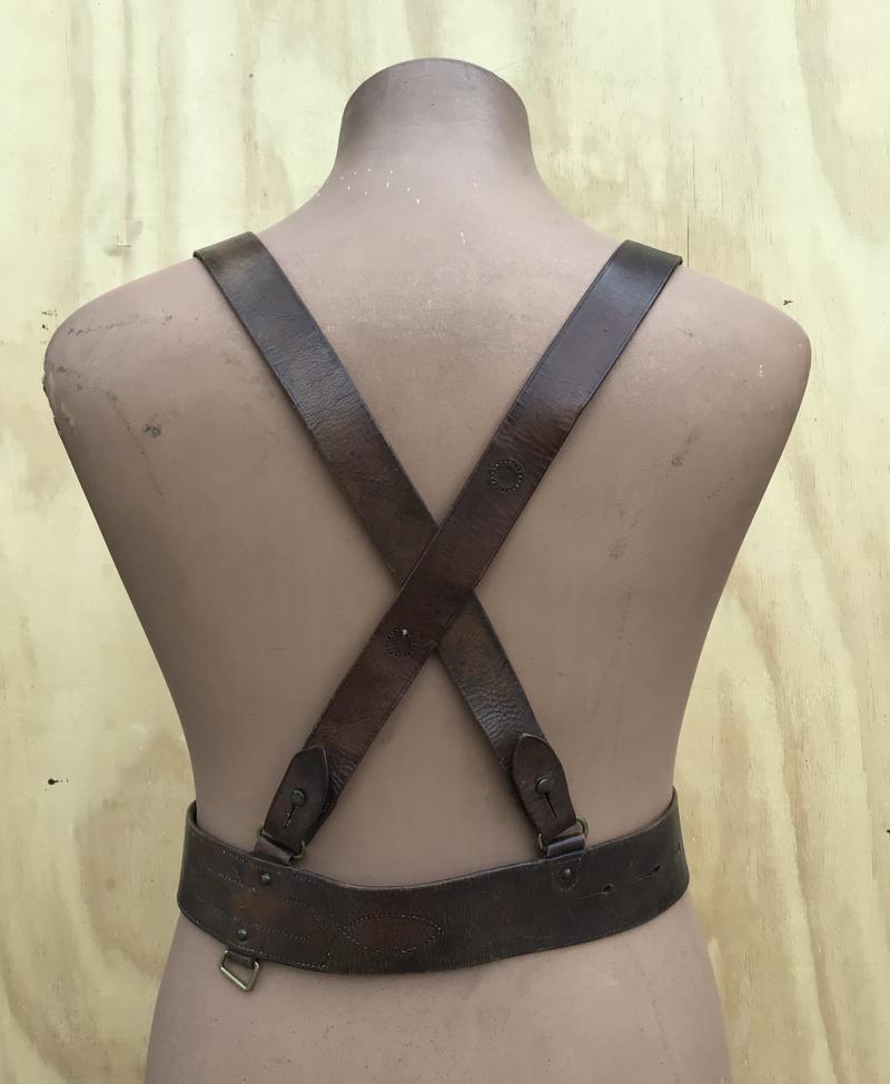 Matching dark brown leather belt and double cross straps. The buckle tab dated 1896 or 1898, hard to read. Good supple leather. The belt extends to approx 940mm.
