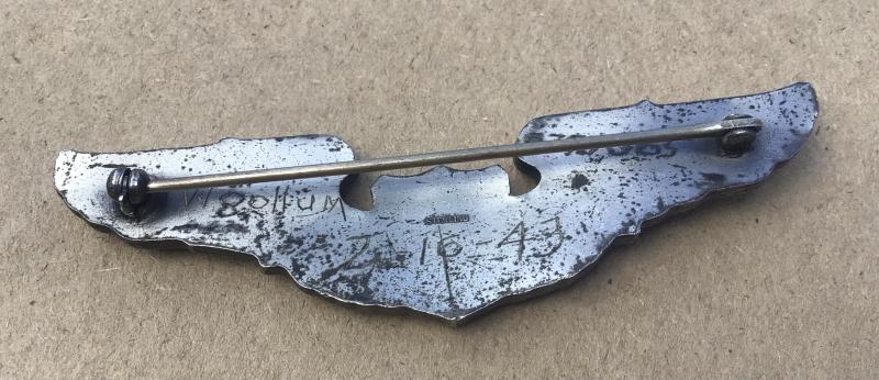 Original full size wings. The reverse with a brooch pin with rolling catch. Marked “Sterling” and has a part name, serial number and dated 1943.