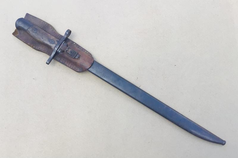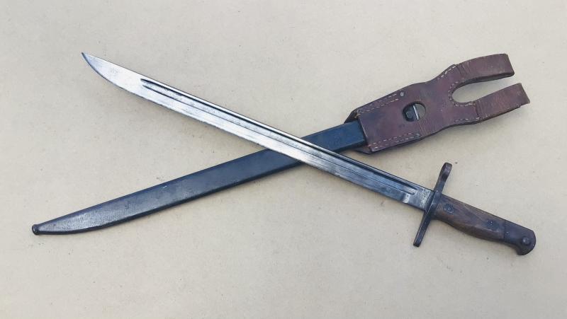 A good mid war example with straight cross guard. The blade with only light age tone and has the arsenal makers mark. Good original wooden grips and working locking stud. Comes with its all steel scabbard. fitted with an original brown leather frog.