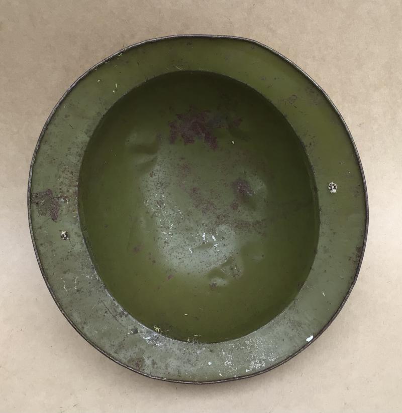Lightweight pressed tin. Probably made by the iconic tin toy maker “Cyclops”. There would have originally had a paper “Cyclops” label on the inside but has long since worn off. No lining or chinstrap. Overall light dents and retains its original period khaki green painted finish. Approximately 235mm in diameter. A rare addition to the Australian WW2 or helmet collector.