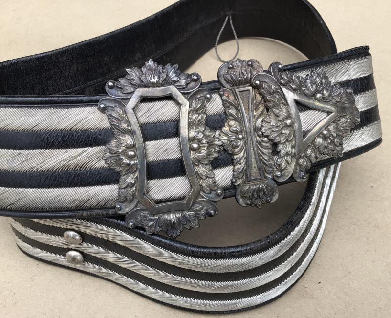Black leather officers cross belt with triple silver bullion striping and silver belt fittings. Unfortunately missing the two metal belt attachment loops on either end that would usually clip on to the cartouche.
