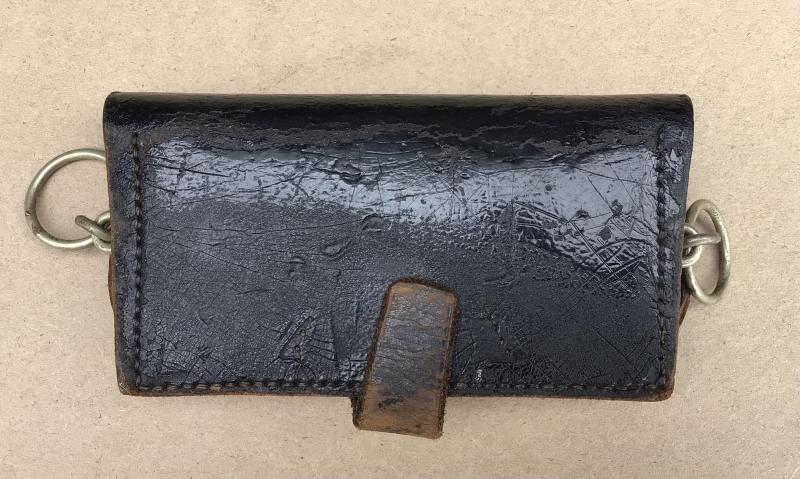 Patent black leather cartouch with white metal belt loops and a white metal QVC Rifles pouch badge ( screw post reverse). Lovely overall condition.