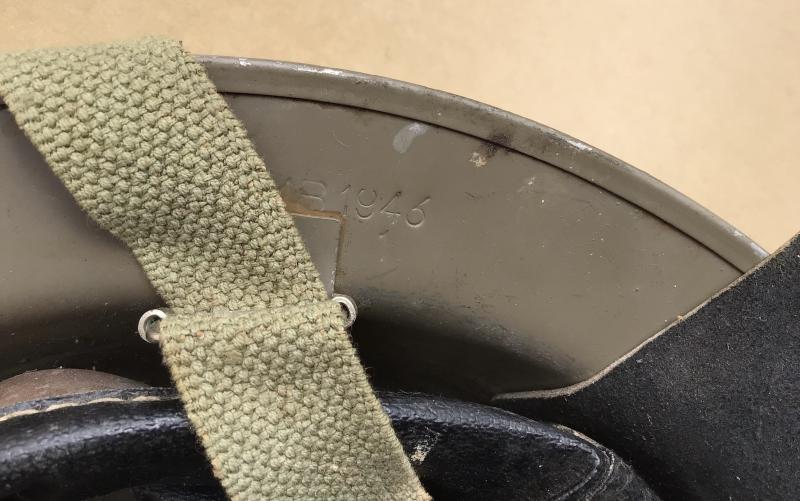 Light olive green painted finish. Has an original black leather neck flap in nice supple condition. Black oil cloth liner and chinstrap. Dated on the underside of the rim 1943. Issued and used. Y both civilian AFS and military fore fighting units.