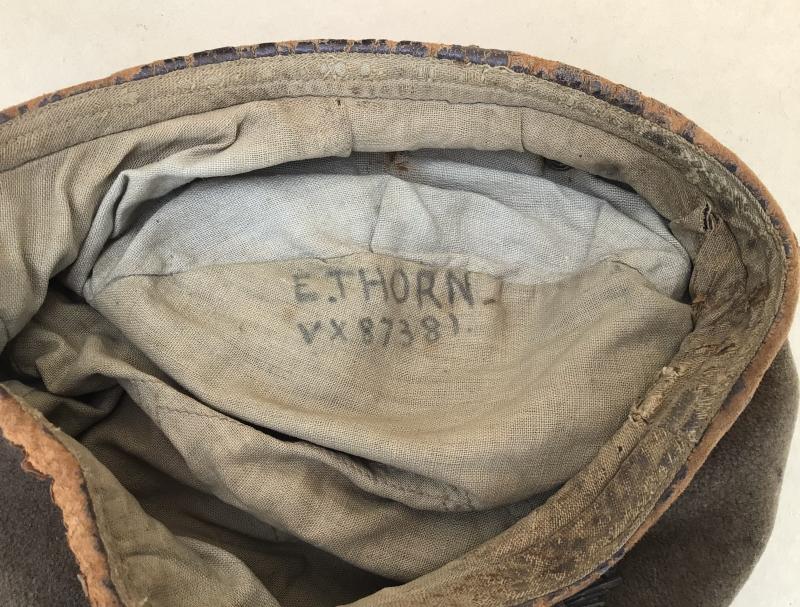 A quite well service worn example in brown khaki wool with a brown leather reinforced bottom edge. Large hat size rising sun fitted to the front. The cotton interior lining intact, and with original name and regimental number. These berets are getting extremely hard to find.