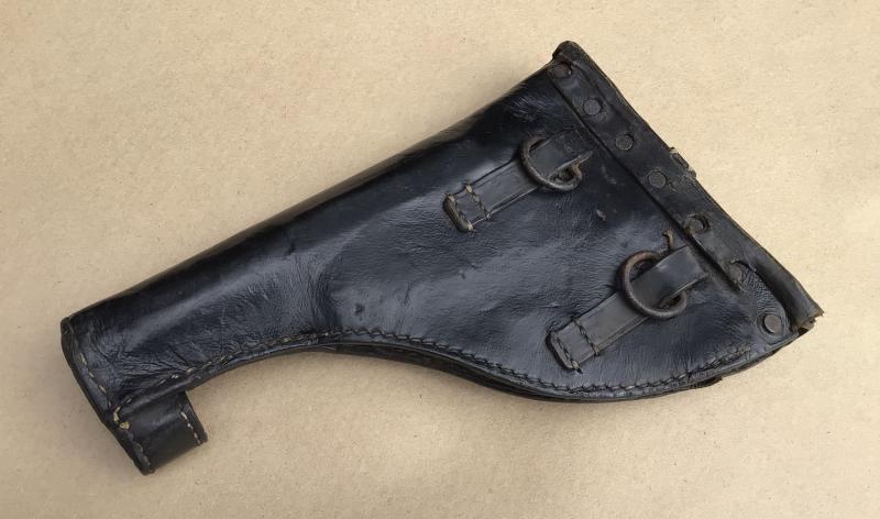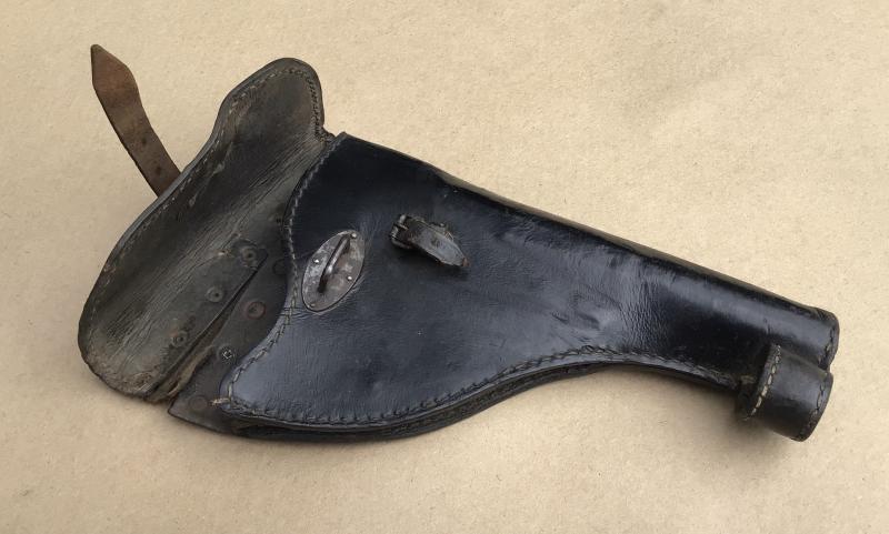 A choice example with lovely Cesar markings, date and waffenamt stamps. Working order. Comes with an original black leather holster. This with overall service ware. The flap separating from the securing rivets at three places on the rear. It still attached. No shoulder sling or cleaning rod. Both pistol and holster seldom seen together for sale.