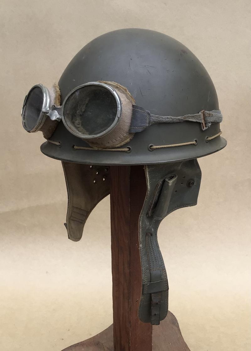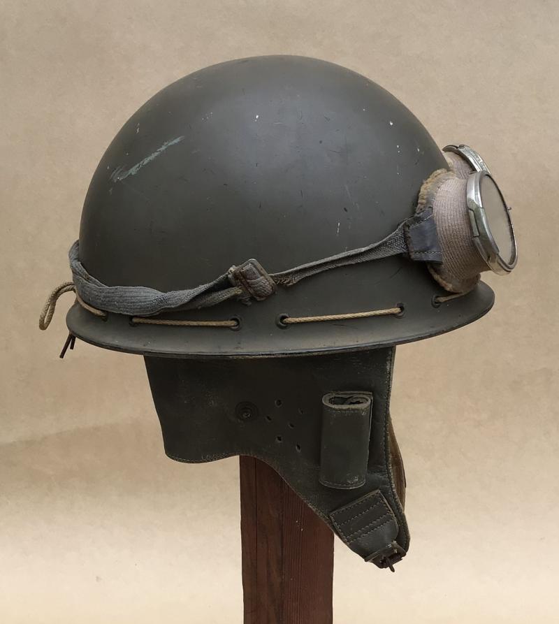 Has all of its original khaki green painted finish, the leather and khaki cotton neck flaps are complete and undamaged retaining the buckle and strap. A good original liner but as usual the felt inner lining well mothed. 1943 dated on the red inside decal label. Together with a pair of WW2 army dust and wind goggles.