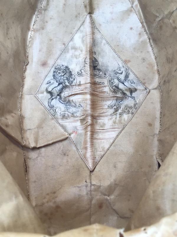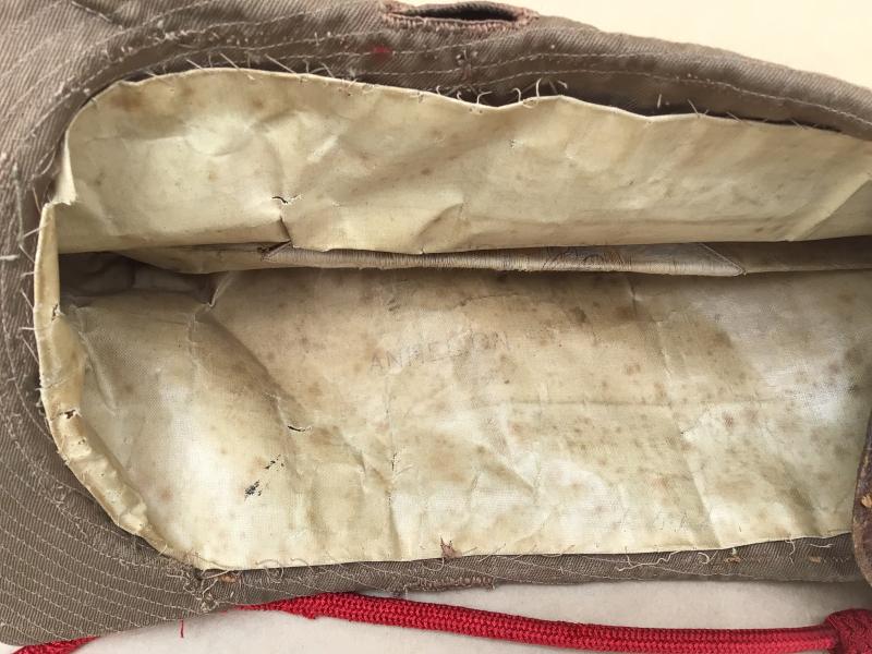 A very rare private purchase piece of Boer War period British Headgear. Lightweight khaki cotton material without frame marketing it collapsible to fold flat. Fold up sides secured by small horn buttons. The sides anre able to fold down to give a more of a slouch hat appearance. The front peak with a brown leather weather protector covering. Scarlet red piping to the top of the crown. Matching red cap lines laced to the rear allowing a for adjustable size and secured through a brown leather rear short neck flap protecting the back of the head from rubbing on the cap lines. The cap lines terminate in a small oxidized spring clip. Has a Hussar Officers gilt bullion cockade with a long brass slider fitted to the front in the manner as worn on the usual Hussar busby. Silk oilcloth lining with manufacturer label of what looks to be “J and G Ross of Exeter”. This is very hard to read as the label is frayed. There is also on both side of the lining “Anhelion REGd”. Wear to the lining consummate with age. Very good condition and a most interesting piece of British military headgear as worn in India or during the South African War.