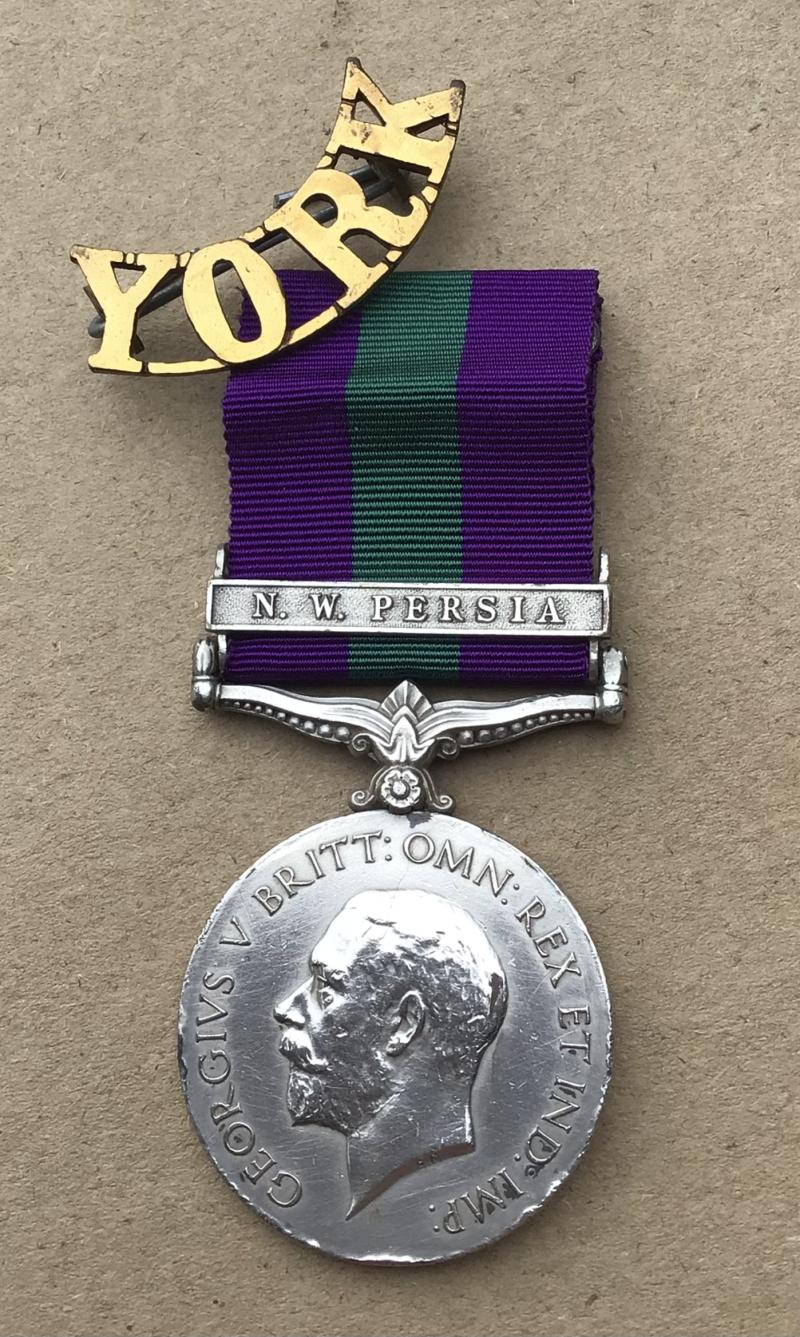 Claps “NW Persia”. Original full size medal correctly impressed “4736819 PTE E BRAY Y&L R”. Small edge knocks. Together with a single brass shoulder title.