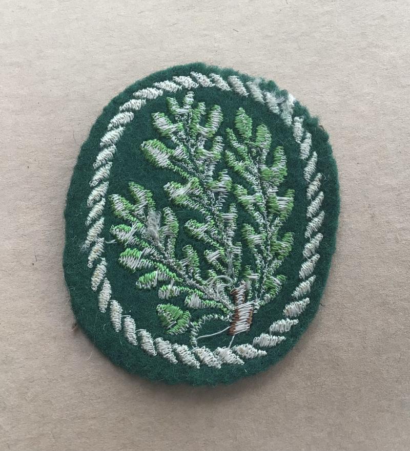 An original distinctive sleeve insignia for light infantry (Jäger) units, introduced in October 1942, featuring green oak leaves and an acorn on a bottle-green wool background, worn on the upper right sleeve, with machine-embroidered or woven versions for enlisted/NCOs.