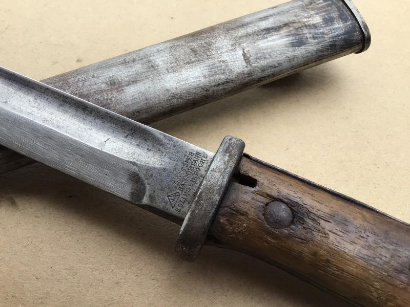 A fair example of this pattern. The blade maker marked “Gottlieb Hammersfahr” and dated 1916. Original wooden grips, working locking stud and comes with its all steel scabbard that fits well to the blade. The scabbard with evidence of having been cleaned back to base metal.