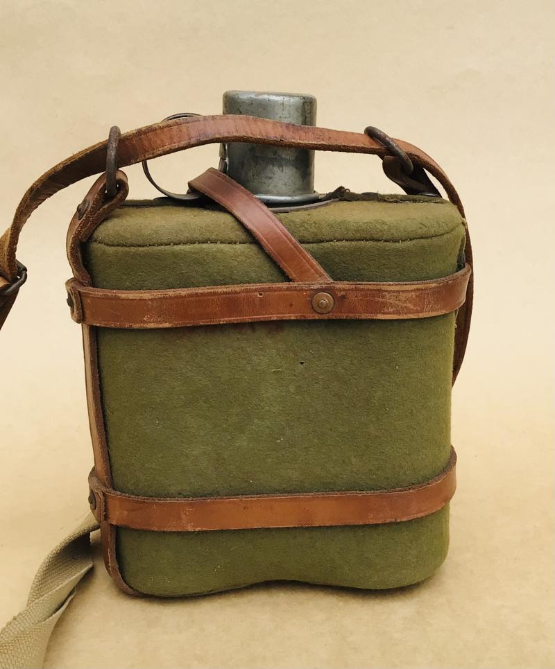 Tin water bottle with small tin drinking cup. Khaki wool felt cover and brown leather harness. Excellent condition overall. No markings or dates.