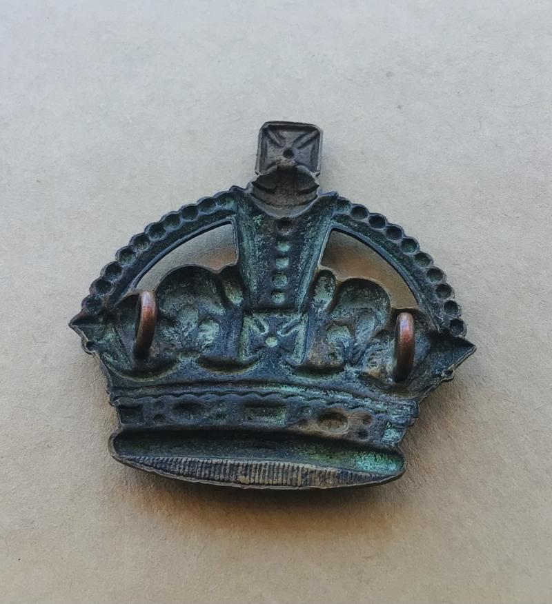 Worn by Company Sergeant Majors post 1915 as Warrant Officer Class 2. Large die struck brass Kings crown with 2 x lug reverse. Approximately 40x44mm.