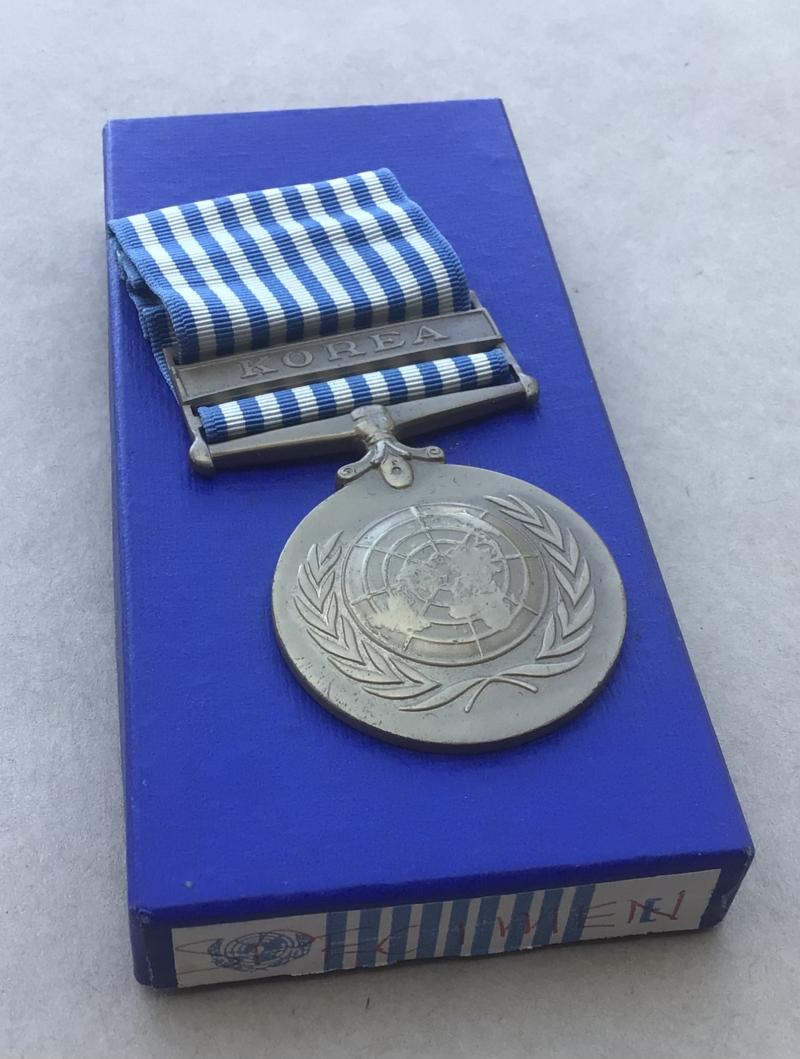 United National Korea Medal - Unnamed as issued. The issue box is a US style and marked “Specimen”. Original full size medal. Unmarked and unnamed.
