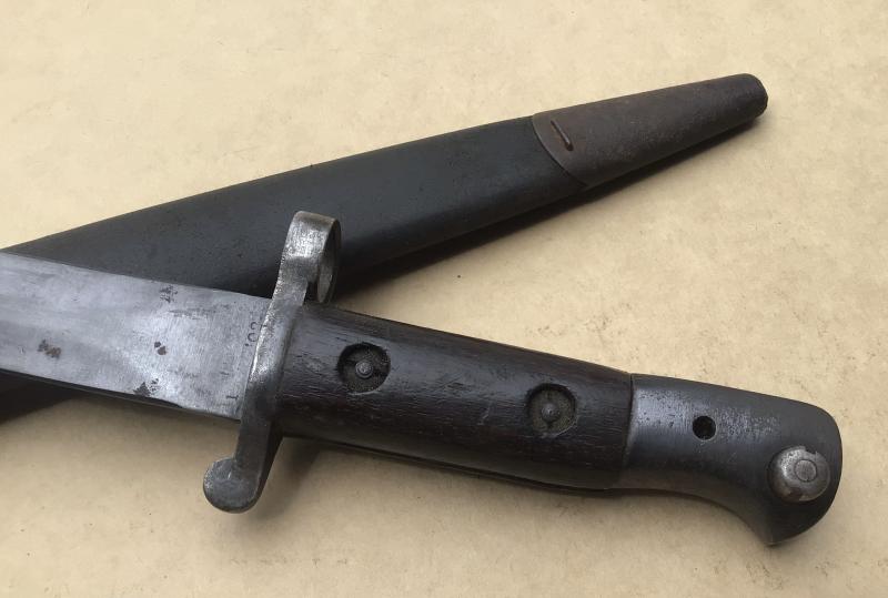 Early refurbished Pattern 1888 blade with adapted Pattern 1903 pommel. The pommel marked with later Sanskrit stampings. The blade with period heavy bluing, Makers mark illegible and dated 1902. Original refirbished (1903) wooden grips. Working locking stud. Comes with its leather scabbard by Enfield and dated 1900. Complete with a white blancoed Pattern 1908 web frog.