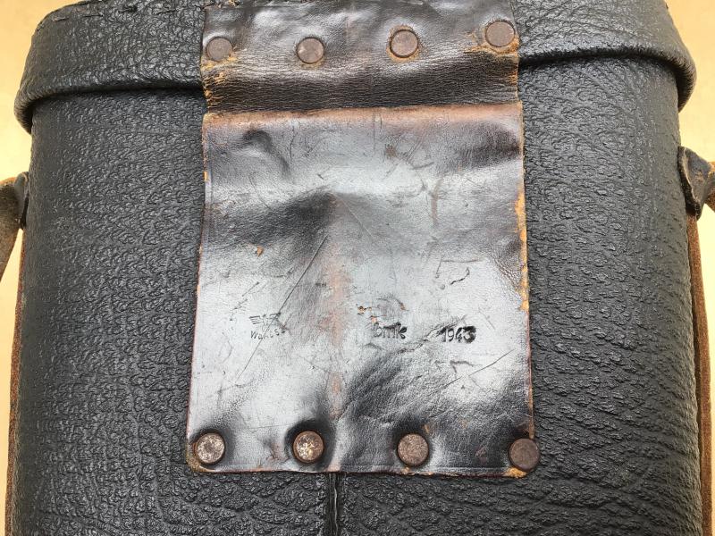 Comes with its original black rubberised canvas carry case maker marked "BMK' , dated and 1943 and with waffenamt stamp. the front pull tab on the lid is broken just a small piece off the bottom and the leather shoulder sling has been shorteded and almost broken through misdeed way.