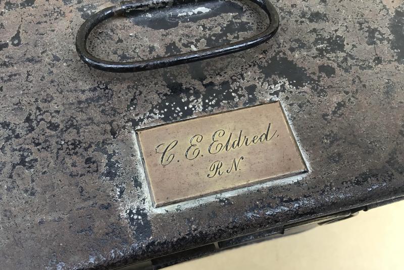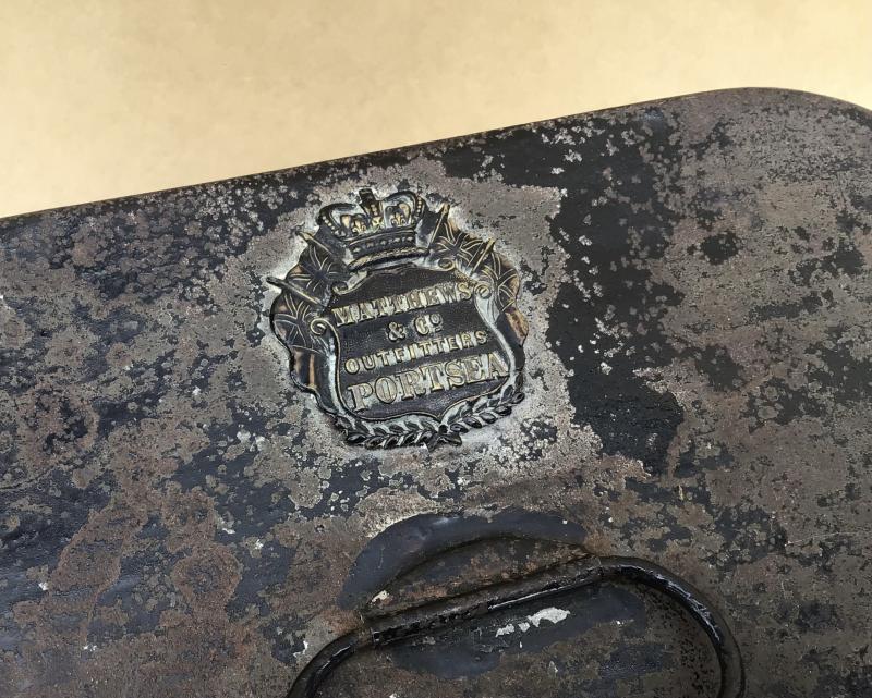 Black Japanned tin storage tine with a maroon velvet padded interior. Used to store a pair of dress Epaulettes. A Queen Victorian crown distributor label to the lid for Matthew’s and Co, Portsea. The brass name cartouche engraved to “C E Eldred”.