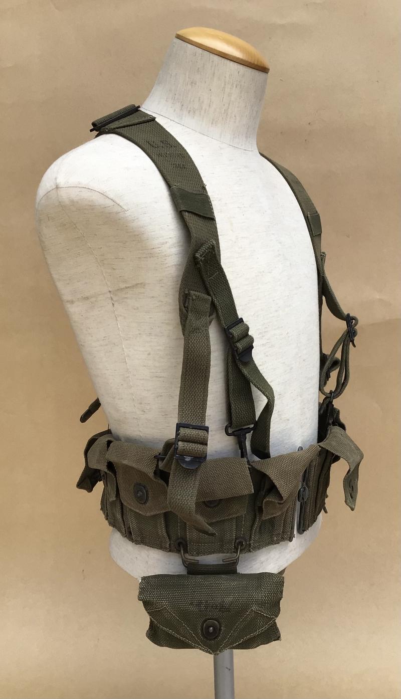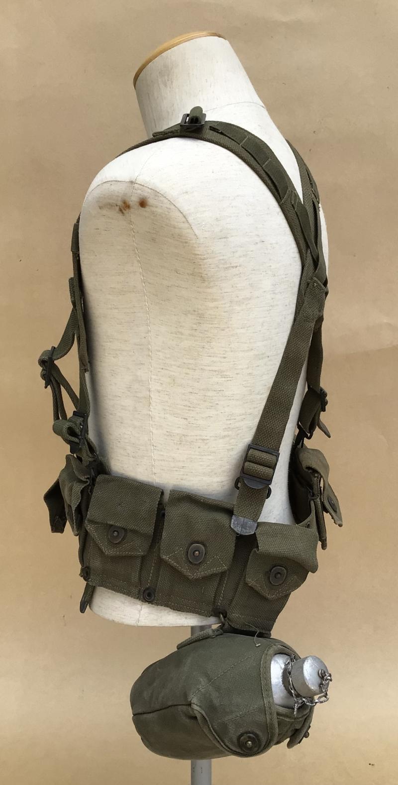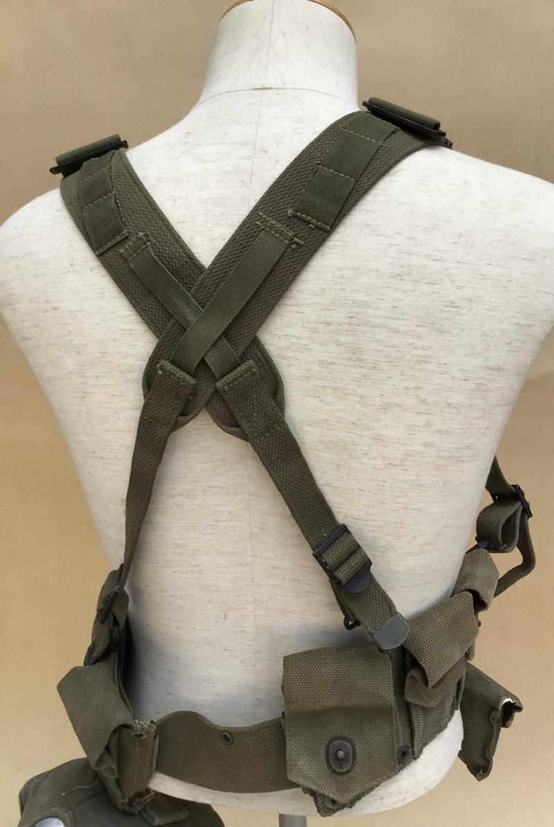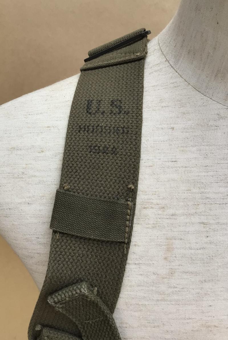 An all matching set in green web c.1944-45 consisting of M 1923 Cartridge Belt, unfortunately the last pouch on the right side has pulled the "lift the dot: press studs away from the web canvas but still displays ok. suspenders date 1944, M1942 First Aid Pouch dated 1954 compete with cardboard First aid Packet. c.1944 canteen carrier , not dated but with a late war wide web loop that secures the belt hook. M1910 water Canteen dated 1942 , Cup M1910 dated 1944.