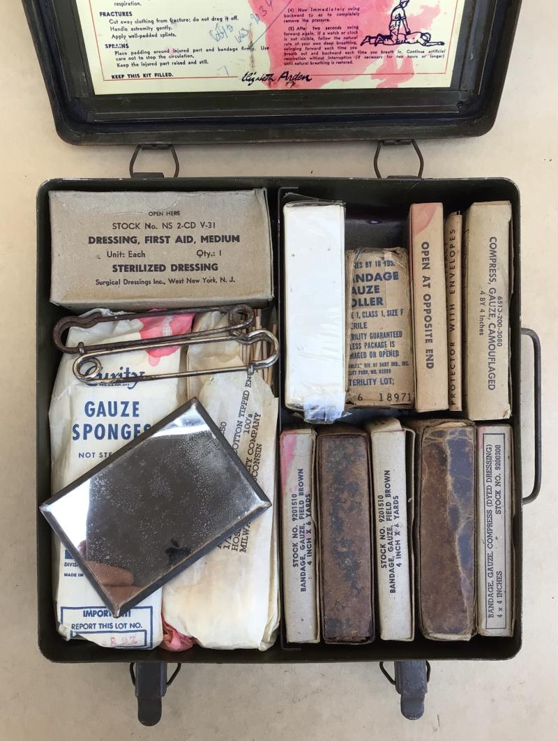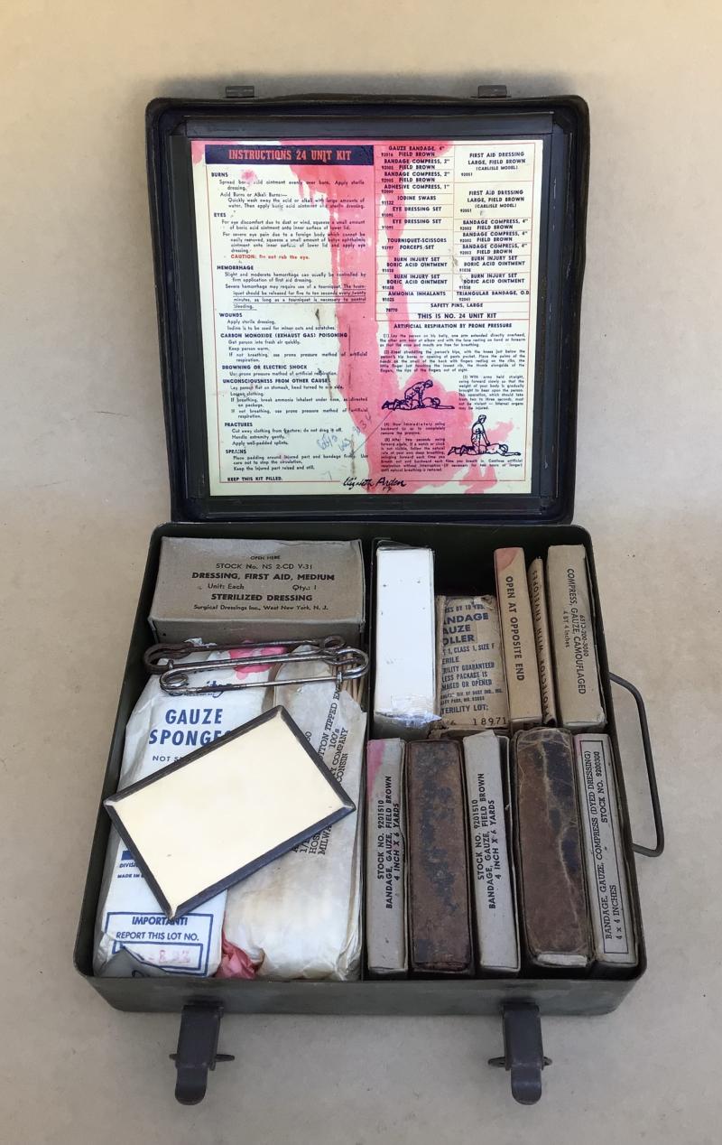 Large size. 235mm x 235mm. An excellent example with nearl all of its original OD green painted finish ad Medical Department Insignia. The inside with the original (stained) Instructions sheet. The contents are not matching with the instruction sheet and mostly consist of numerous first aid field dressings, Gauze bandages, cotton bud applicators, safety pins, torniques, Gauze sponges, scissors etc. Still makes for a very impressive display lot.