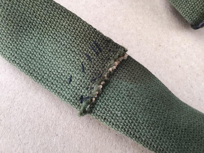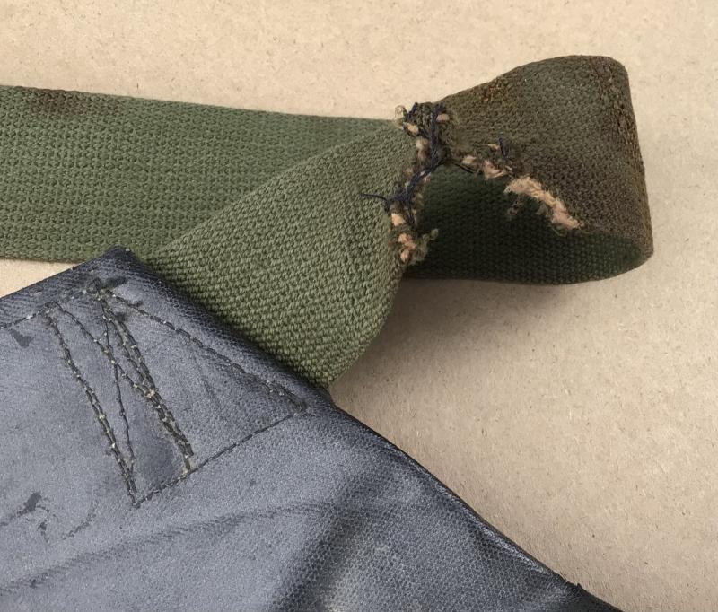 A rubberised waterproof carry bag for issue with the M5 Assault Gas Mask only made between February August 1944. The rubberised canvas in good condition but one of the long wraps broken in half crudely repaired, the other one half torn and in danger of breaking in two.
