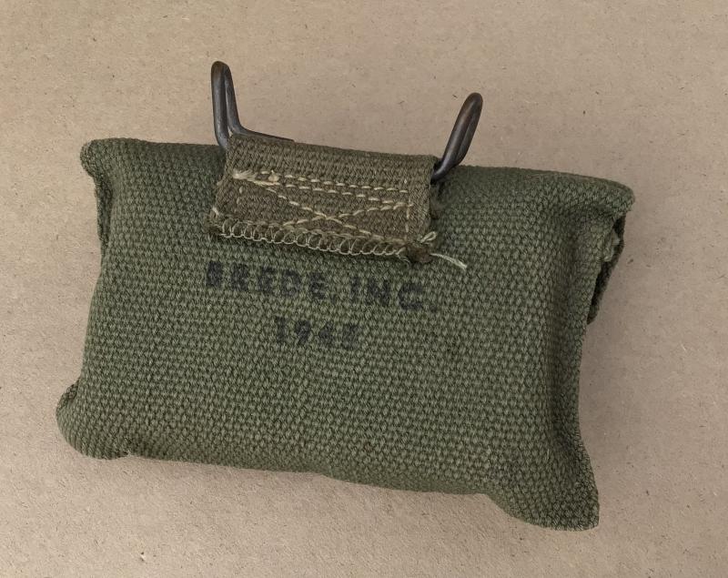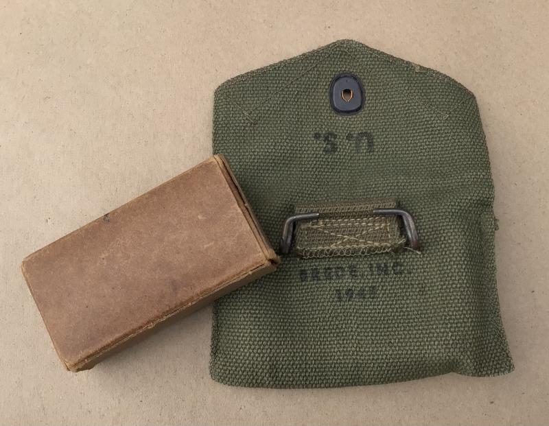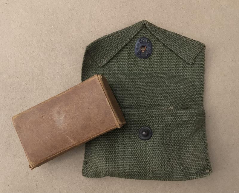 Green Web. The reverse maker marked and dated 1945. Comes with and unmarked cardboard first aid packet.