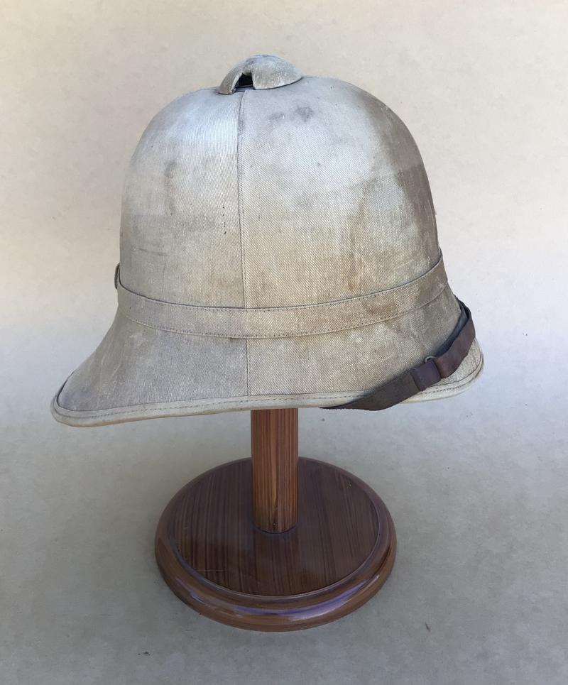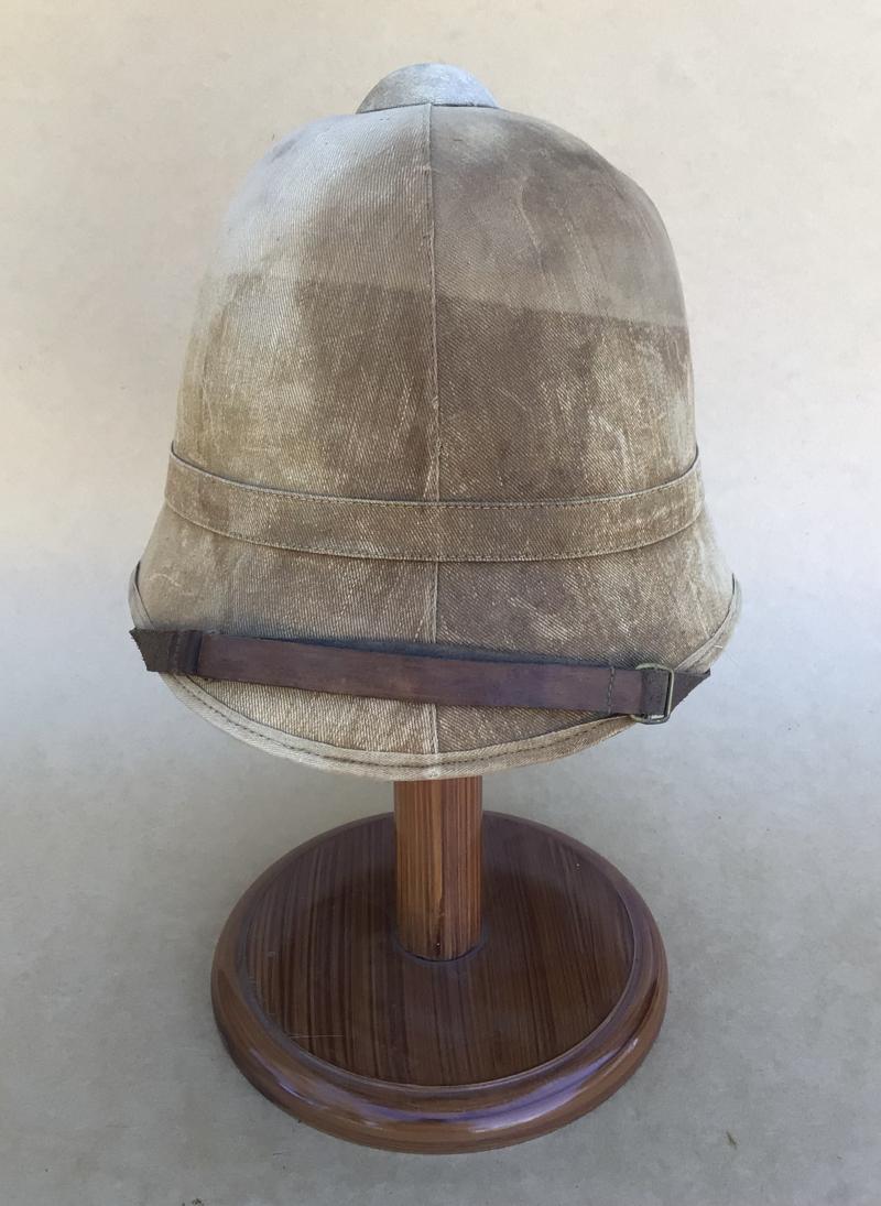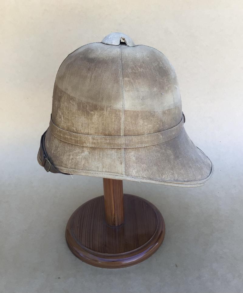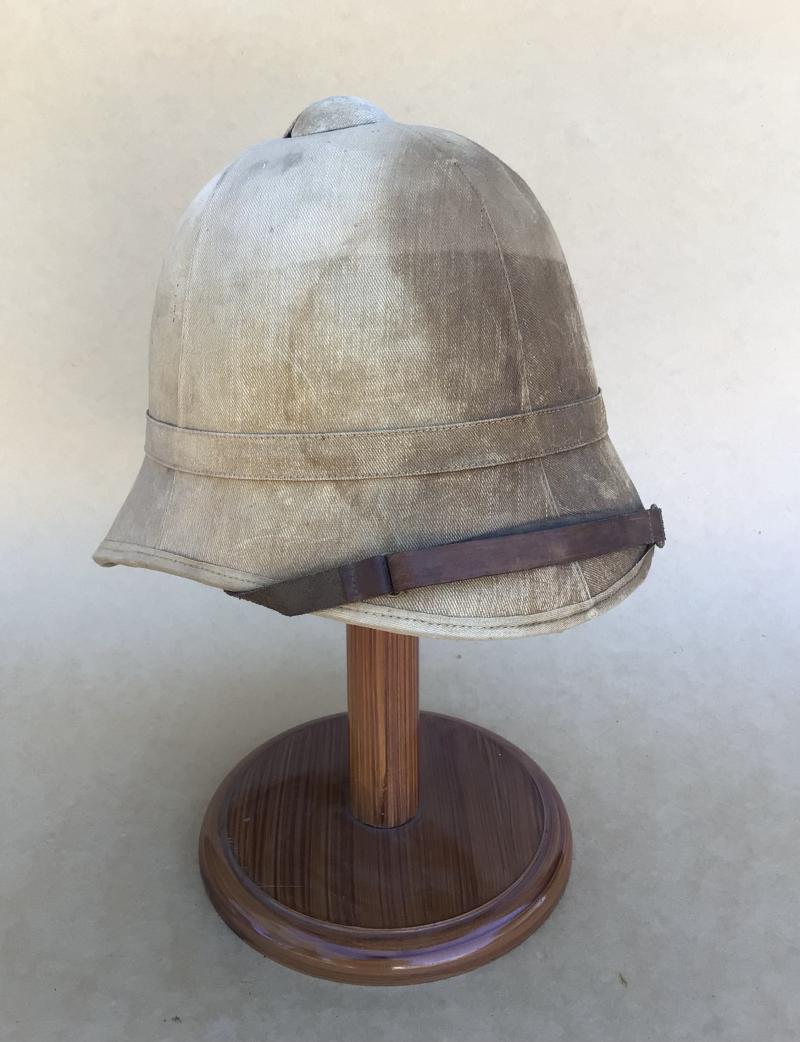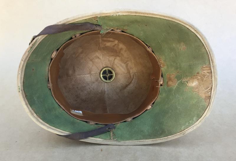 Used extensively in the US - Spanish War in the Philippines and Cuba, this is the US version of the European Pith Helmet. Retainig a very good shape , small dent to the top left hand side but not noticeable. Four panel khaki cotton drill material over cork. The interior is lined with green fabric under the brim and with some frying to he rear, the dome lined in khaki oilcloth. The leather sweatband is still fully intact and fitted wit a nice leather chinstrap.