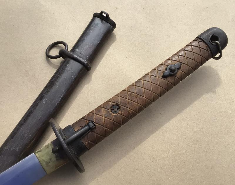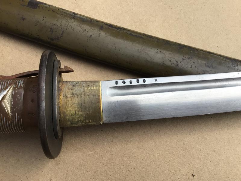 Two piece wooden checkered grips in excellent original condition. Fitted with a machine made blade and this one is in very nice bright clean condition with serial number and arsenal stamp. The serial number is not matching numbered to the scabbard and it also has an inspection mark on the blade by the number. Plain steel non voided 1944 pattern tsuba and pommel. The pommel fitted with a post war additional tassel ring. I have left this on for the use of a tassel but it is very easily removed. The original pattern did not had a tassel ring fitted and thus was simply slipped through the pommel hole.